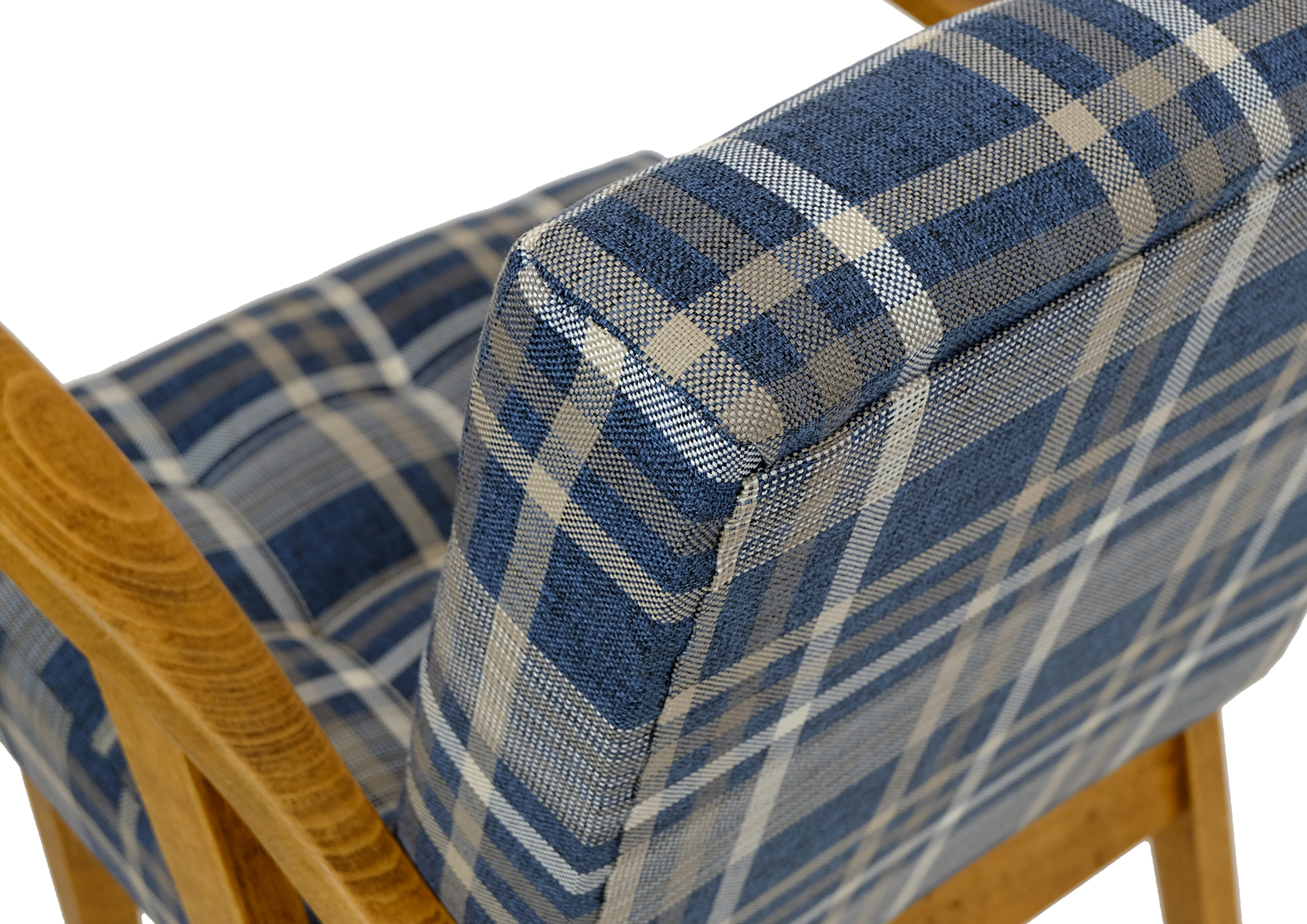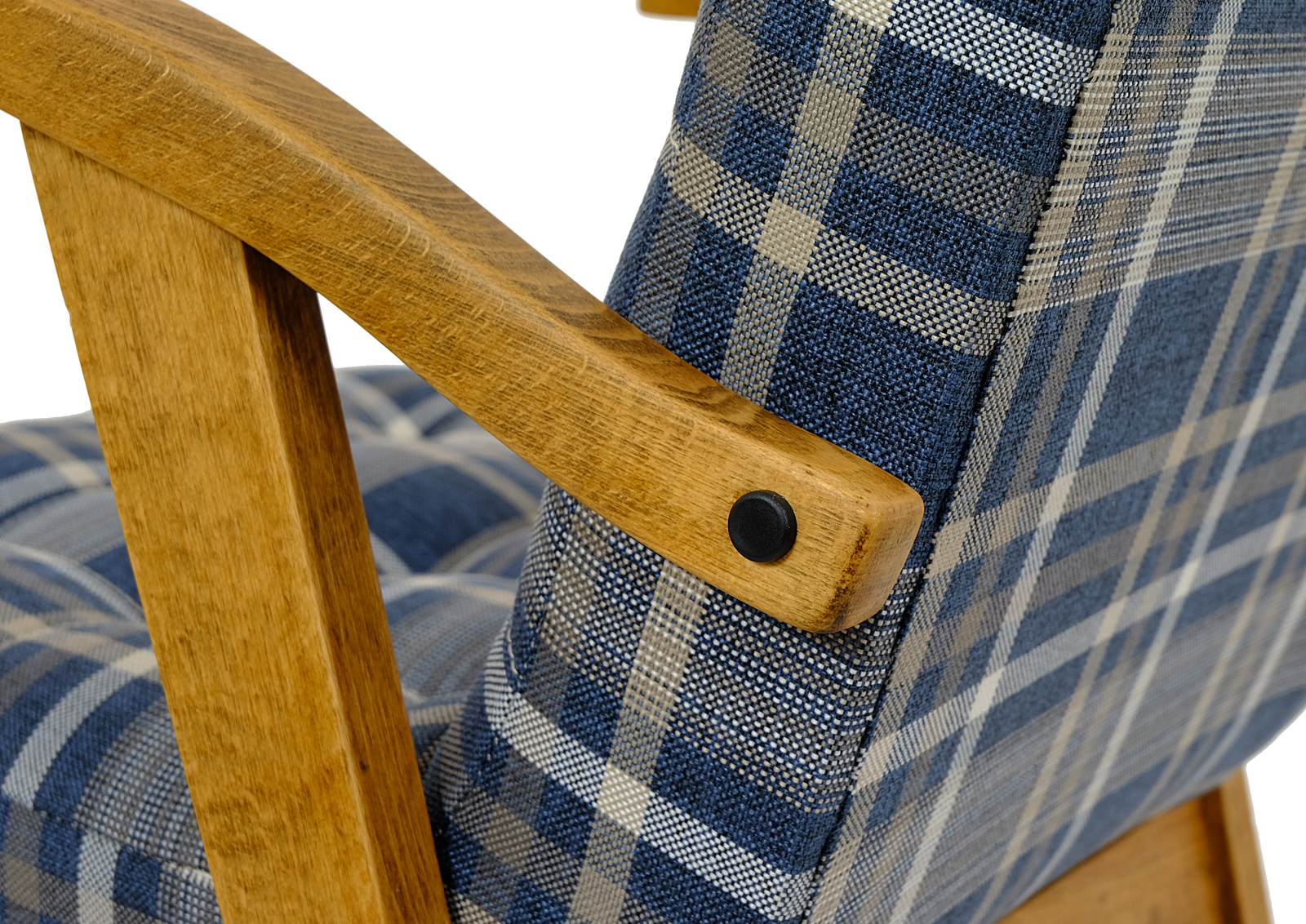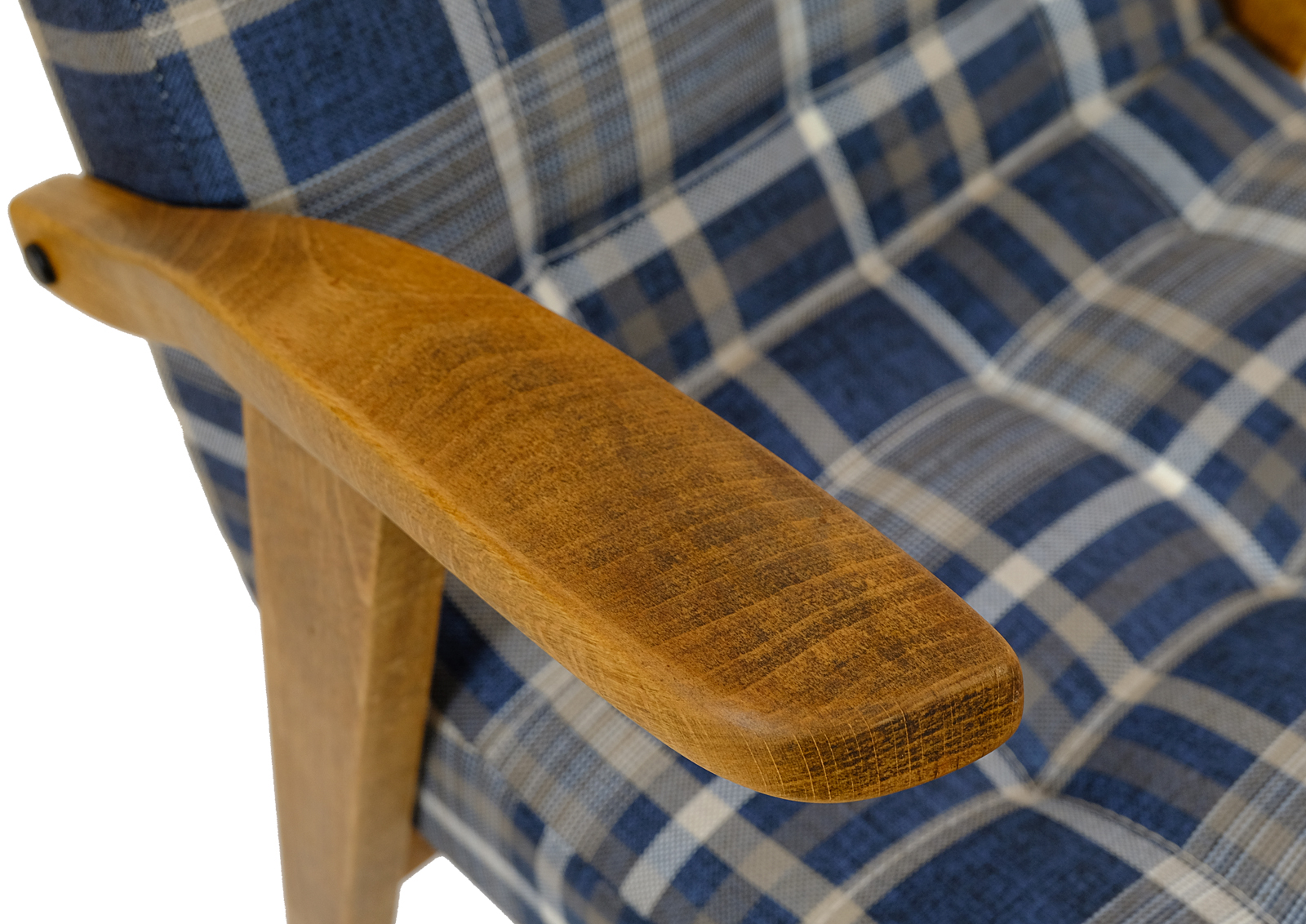 Made of beech. The armchair has been disassembled, the old coats of varnish fully removed, the armchair has then been glued together again, treated with Chinese natural and eco-friendly oil. New upholstery, foam, webbing, and interfacing. Hand sewn. High quality fabric, durable, able to withstand 20 000 double rubs.. Internal scaffolding has been sanded down thoroughly and coated with a protective layer. Quilted seat makes the armchair look elegant. All the legs with good quality felt pads. Cult armchair model from the Polish People’s Republic era.