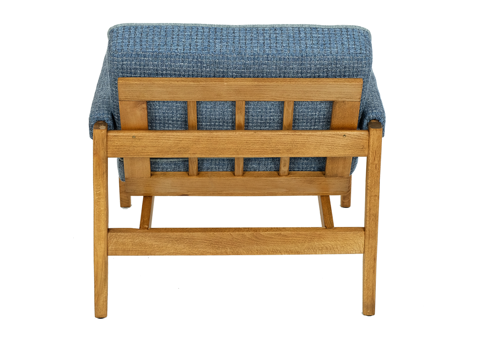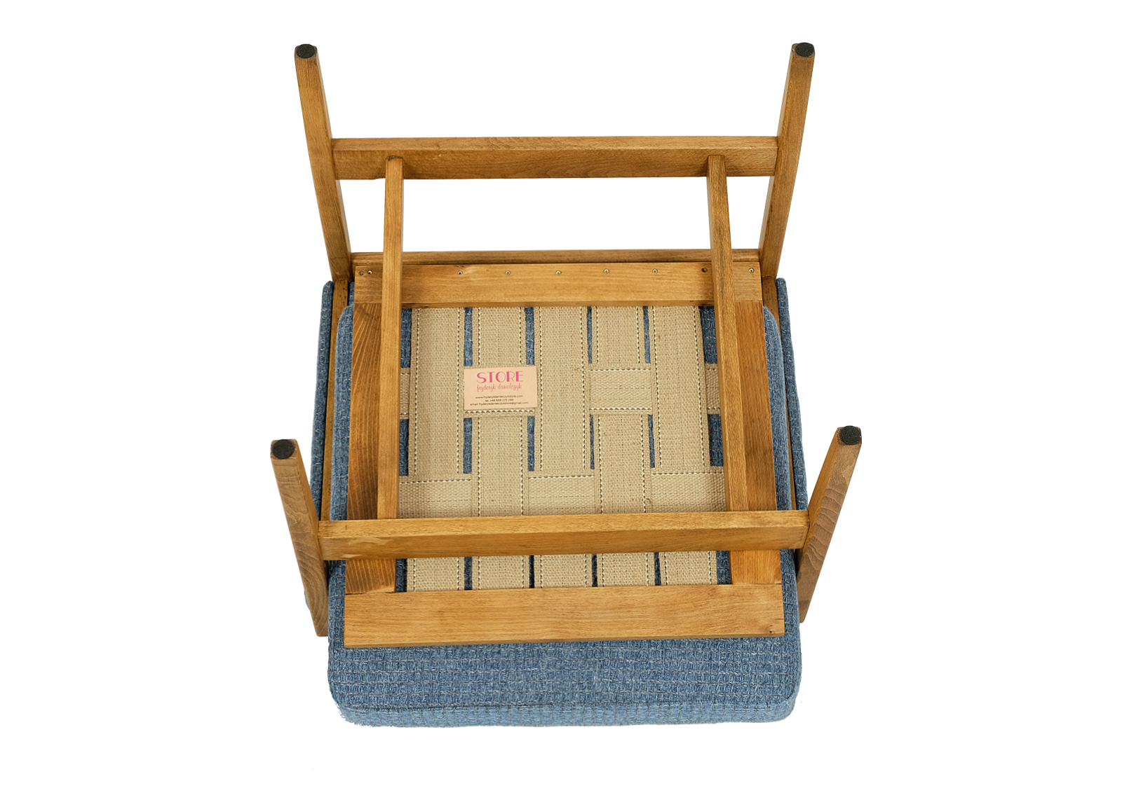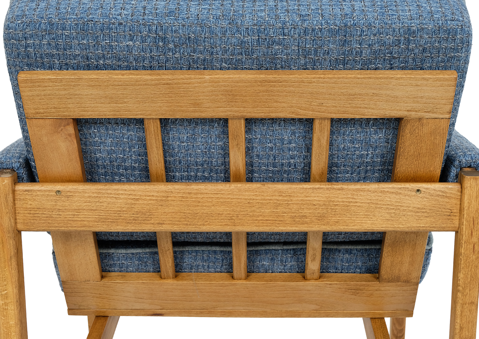The chair has been completely disassembled, the wood was cleaned of old paint coatings, glued again, protected with oil based on natural Chinese oils, environmentally friendly. Beech wood. New upholstery, upholstery foam, belts, padding. Hand-sewn. Good quality fabric, abrasion resistance 30,000 strokes. New metal screws. If you want to relax in a comfortable armchair after your hard day at work, this is the best choice for you. It combines nice look with a great comfort.
