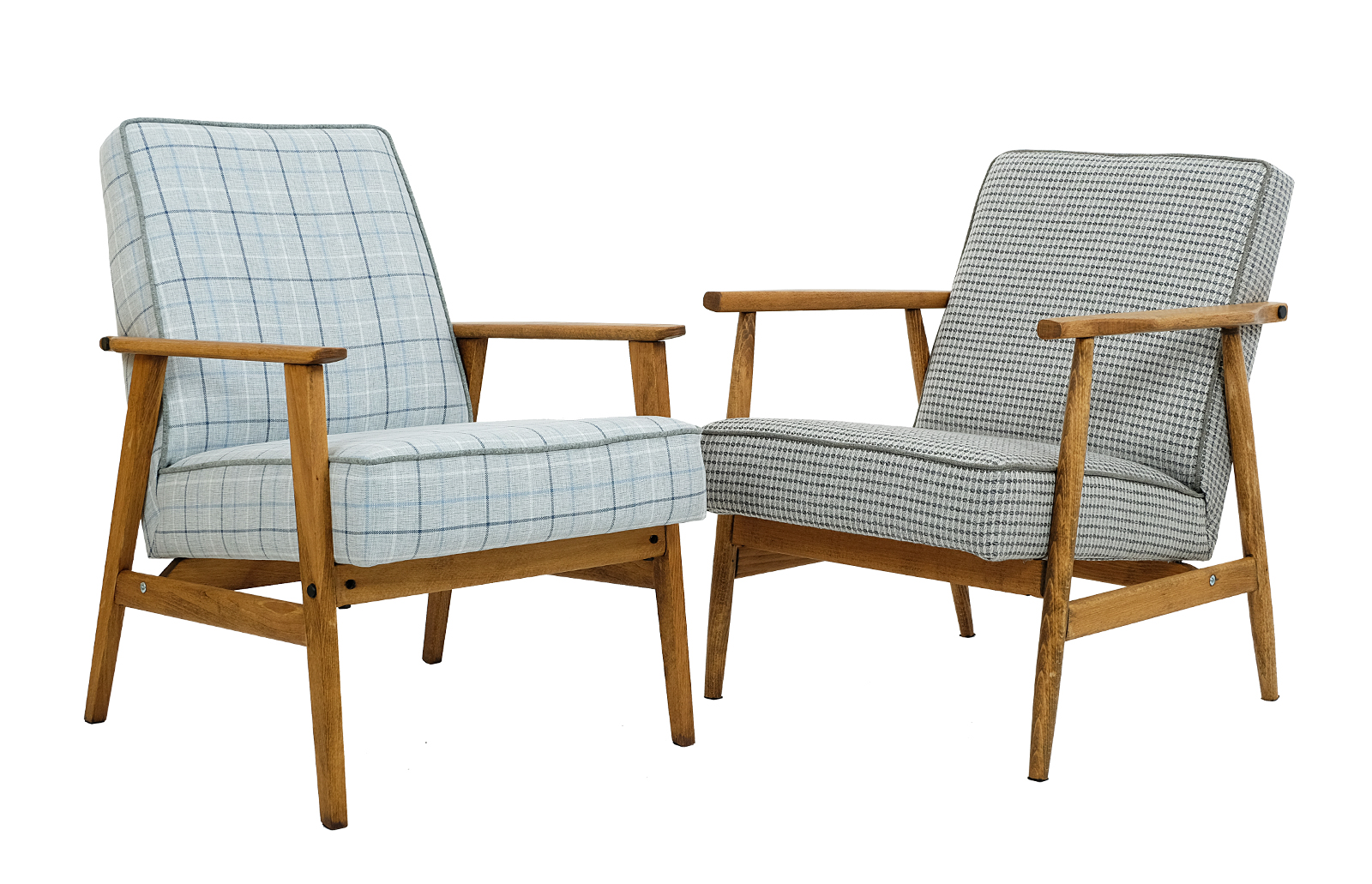 The armchair has been disassembled, the old coats of varnish fully removed, the armchair then has been glued together again, treated with Chinese natural and eco-friendly oil. Beech, new upholstery, foam, webbing, and interfacing. Hand sewn. Very high quality fabric, durable, able to withstand 30 000 double rubs. New metal screws. Internal scaffolding has been sanded down. Cult Lisek model but with a twist.