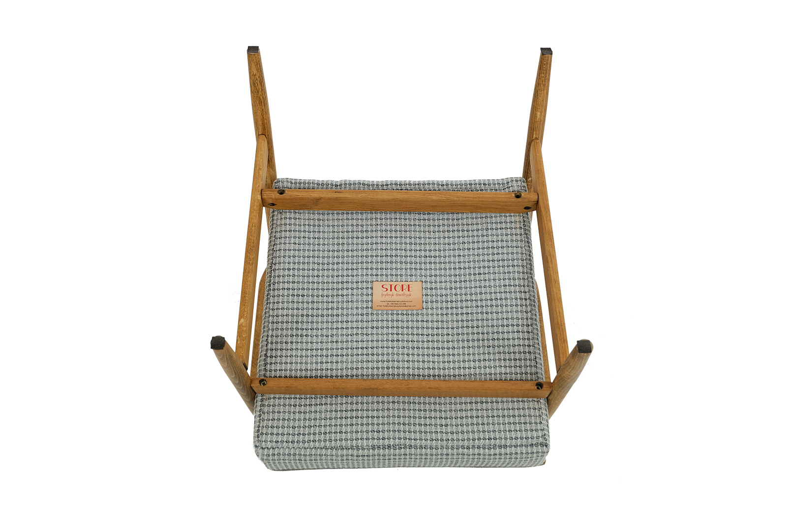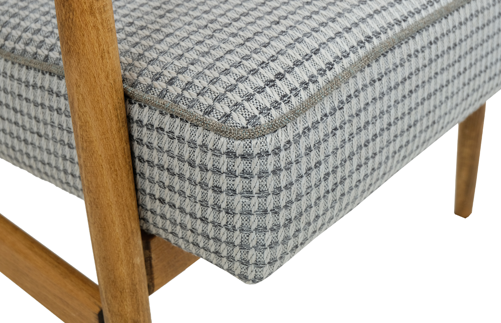 The armchair has been disassembled, the old coats of varnish fully removed, the armchair then has been glued together again, treated with Chinese natural and eco-friendly oil. Beech, new upholstery, foam, webbing, and interfacing. Hand sewn. Very high quality fabric, durable, able to withstand 30 000 double rubs. New metal screws. Internal scaffolding has been sanded down. Cult Lisek model but with a twist.