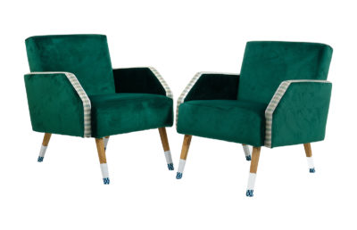 The armchairs have been disassembled, the wood stripped of old coatings of paint, glued and secured with environmentally friendly oil produced from natural Chinese oils. Beech wood. New upholstery, replaced foam, belts, interlining. Handsewn. Fabric of very good quality, abrasion resistance of 30,000 rubs. The tightened side support plates have been additionally lined with foam. New metal screws.