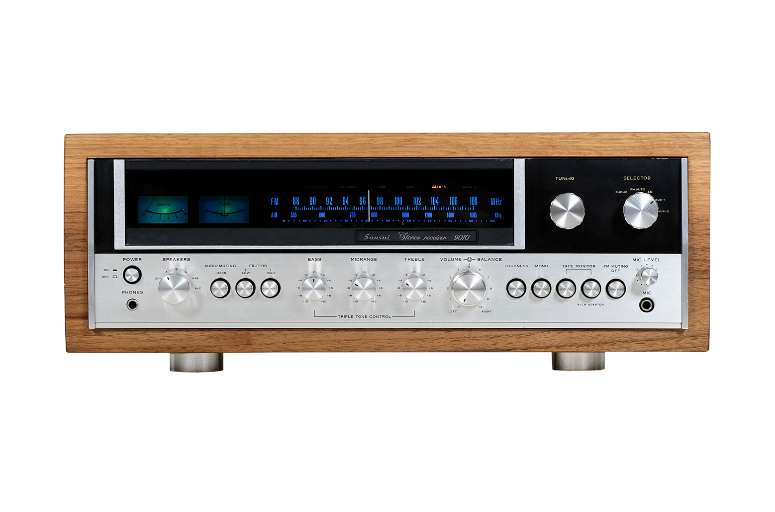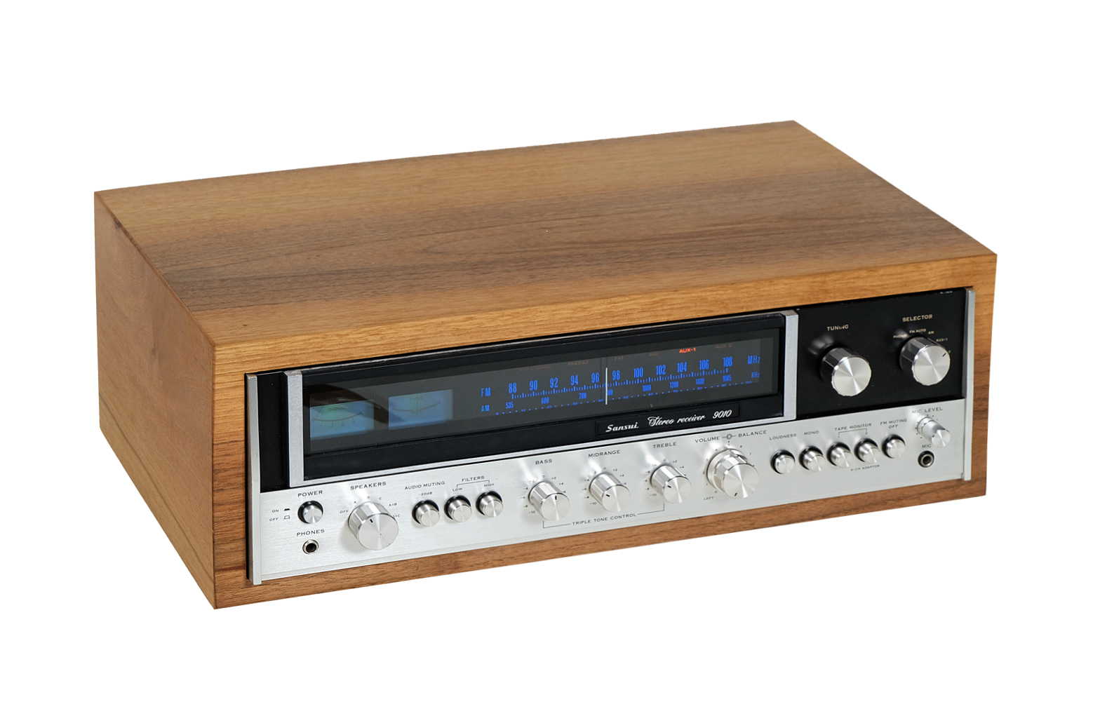 Wyprodukowany w połowie lat 70tych model 9010 to europejska wersja 881 czyli najlepszego w ówczesnej ofercie amplitunera Sansui. Odbiornik ten był również jednym z najwyżej ocenianych na rynku, dzięki zaawansowanym rozwiązaniom technologicznym. Ponadto Sansui 9010 charakteryzuje się dużą mocą i niezwykle czystym brzmieniem, jak również daje możliwość regulacji niskich, średnich oraz wysokich tonów. Dzięki temu słuchacz może cieszyć się wyraźnym, wiernym dźwiękiem o szerokim spektrum, od bogatych i łagodnych basów po przejrzyste soprany. Odbiornik ten wyróżnia się również niezwykle szlachetnym, bogatym w różne faktury dizajnem. Dolna połowa przedniego panelu jest wykonana ze szczotkowanego aluminium, podczas gdy górna ma gładką, czarną powierzchnię pięknie komponującą się z wyświetlaczem skali w tym samym kolorze.