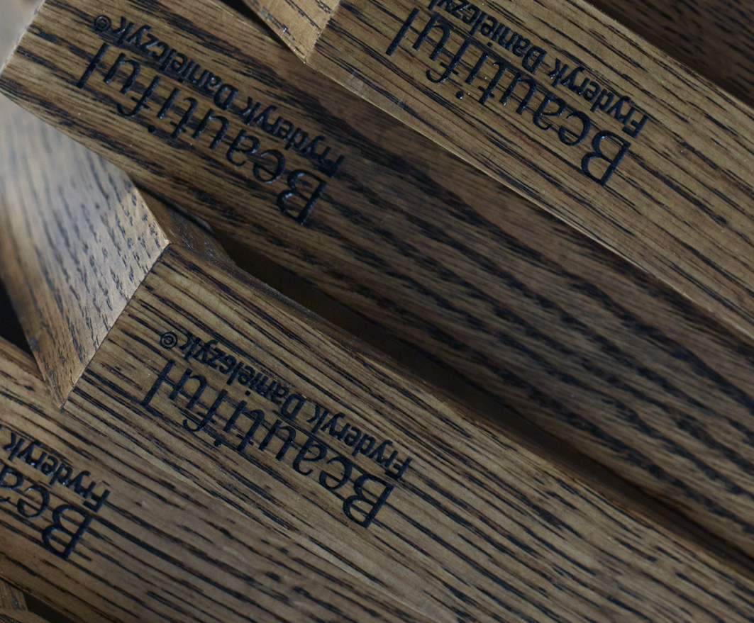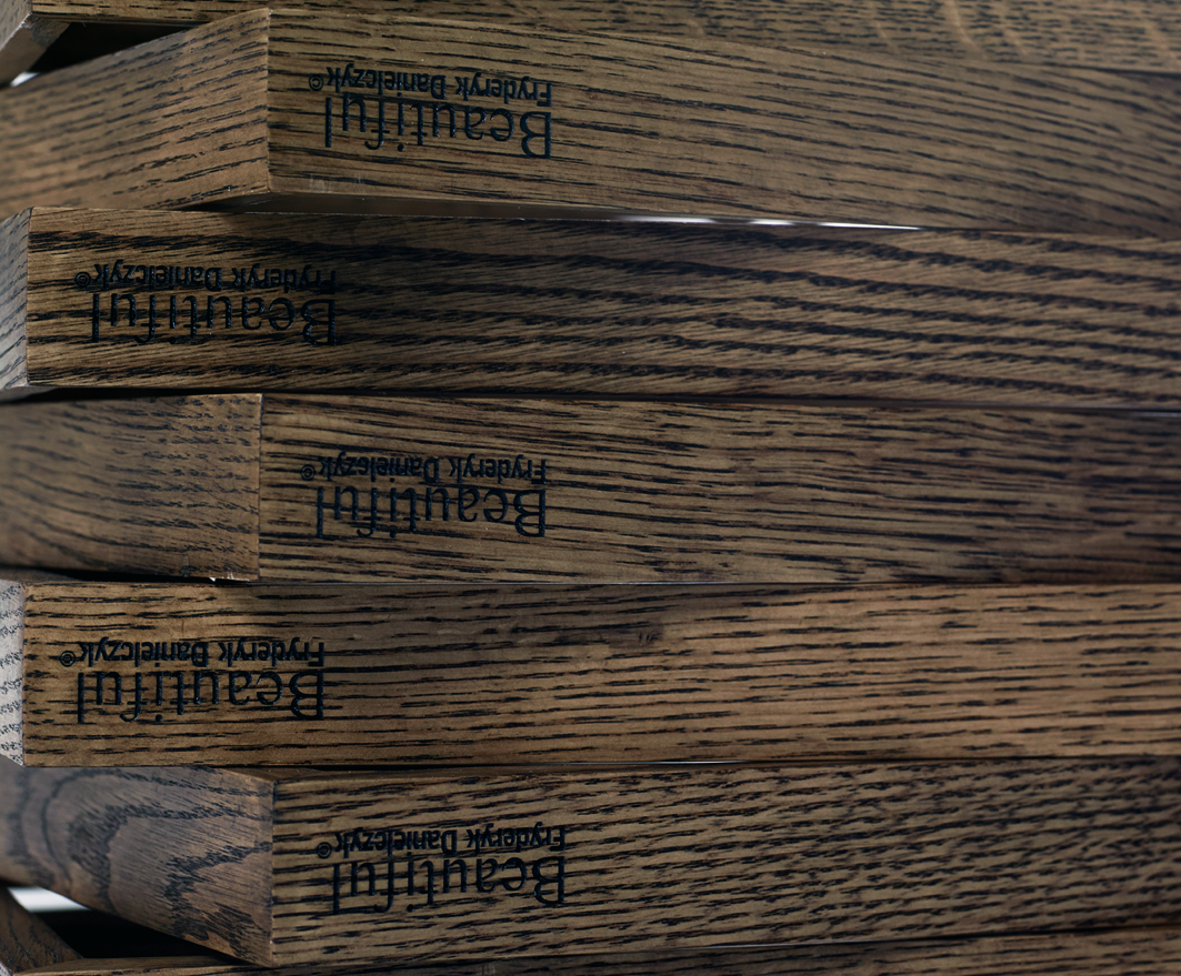 – autorska rama z dębu czerwonego, 8-12% wilgotności, malowana olejem na bazie naturalnych olei chińskich, kolor palisander, wylaserowany tytuł w prawym dolnym rogu