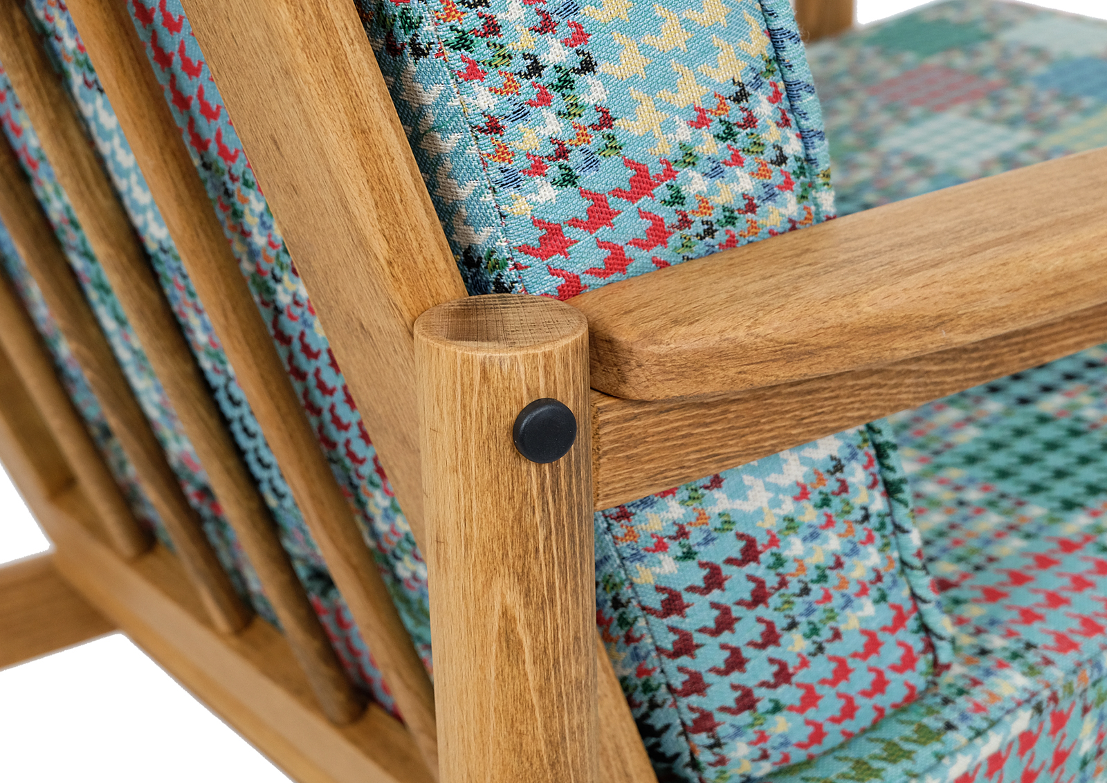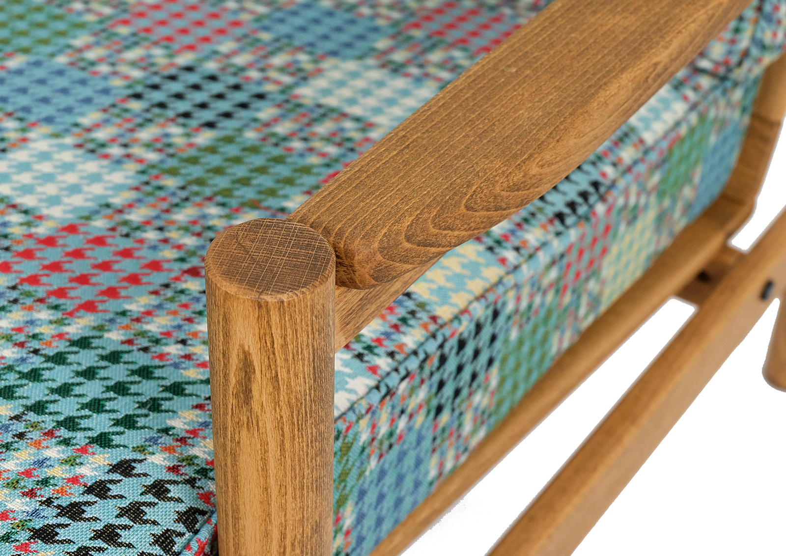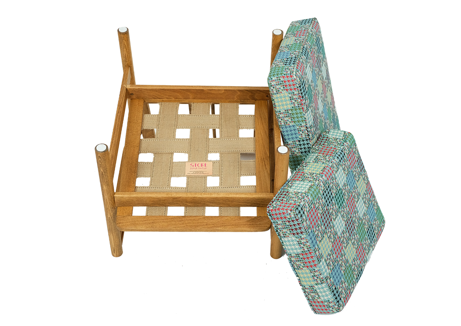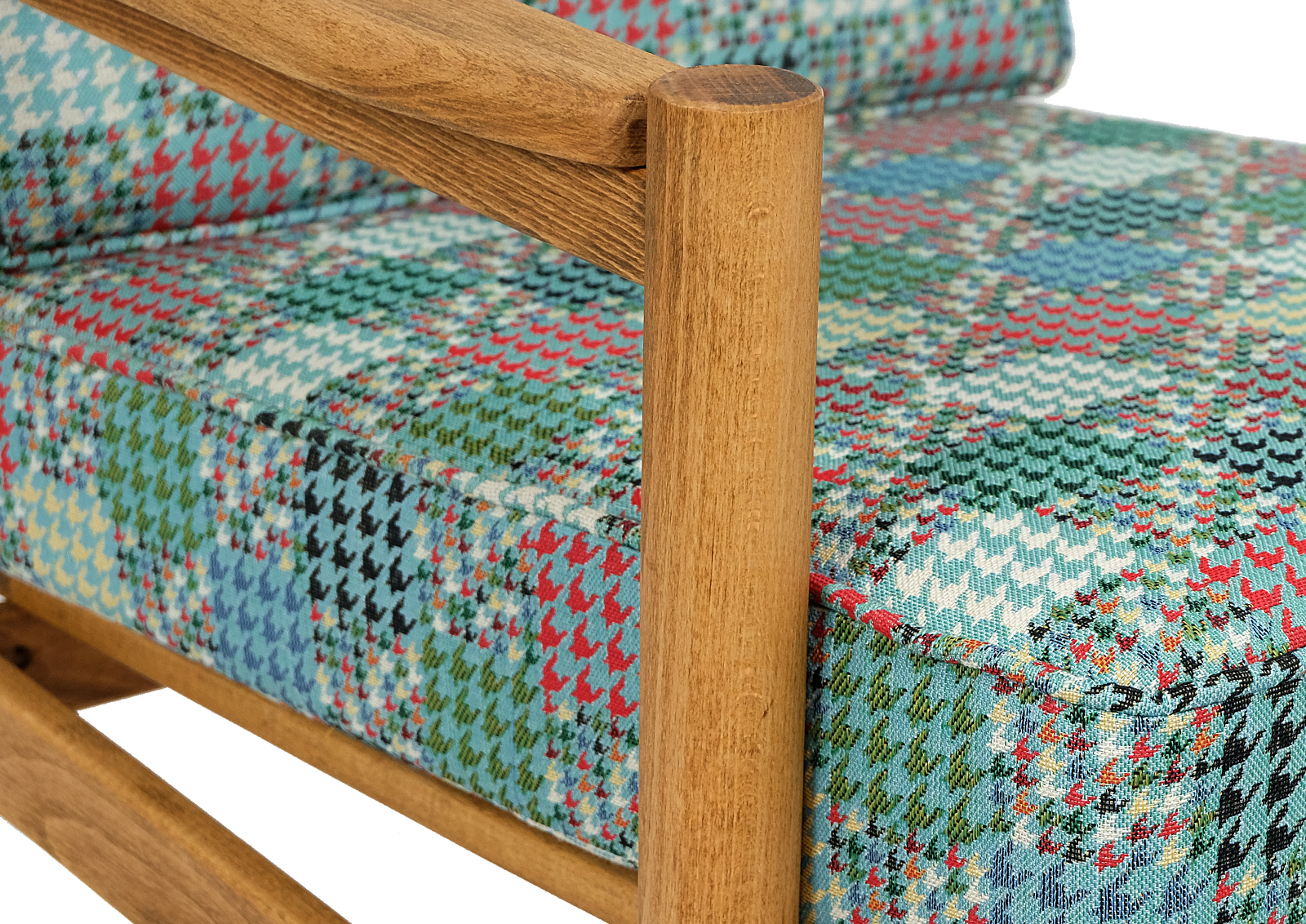Fotel został całkowicie rozebrany, drewno oczyszczone ze starych powłok lakierniczych, sklejony ponownie, zabezpieczony olejem na bazie naturalnych olei chińskich, przyjaznym dla środowiska. Drewno bukowe. Nowa tapicerka, wymieniona gąbka, pasy, fizelina. Ręcznie szyty. Bardzo dobrej jakości tkanina, odporność na ścieranie 30 000 suwów. Nowe metalowe śruby. Szkielet wewnątrz oczyszczony dokładnie papierem. Wygodny i komfortowy, piękny i praktyczny.