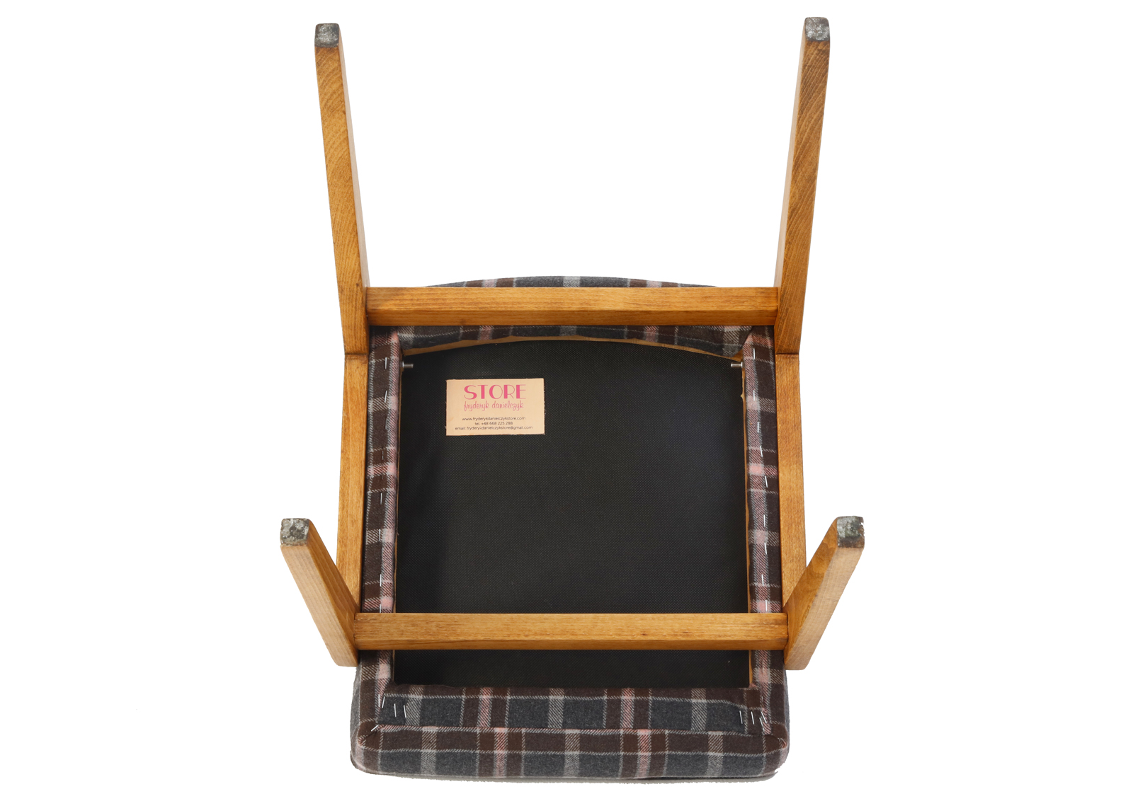 Fotelik został całkowicie rozebrany, drewno oczyszczone ze starych powłok, ponownie sklejony, zabezpieczony olejem na bazie naturalnych olei chińskich, przyjaznym dla środowiska. Drewno bukowe. Nowa tapicerka, wymieniona gąbka, pasy, fizelina. Ręcznie szyty. Nowe metalowe śruby. Szkielet wewnątrz oczyszczony dokładnie papierem, zabezpieczony. Bardzo miękka i przyjemna w dotyku flauszowa tkanina, odporność na ścieranie 20 000 suwów. Kultowy model fotela PRL.