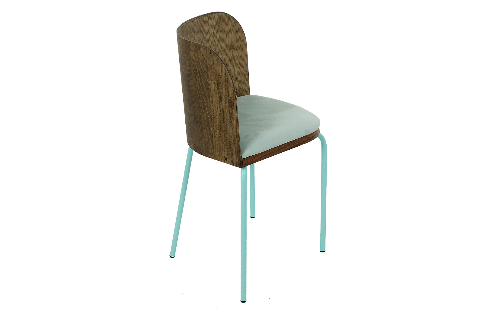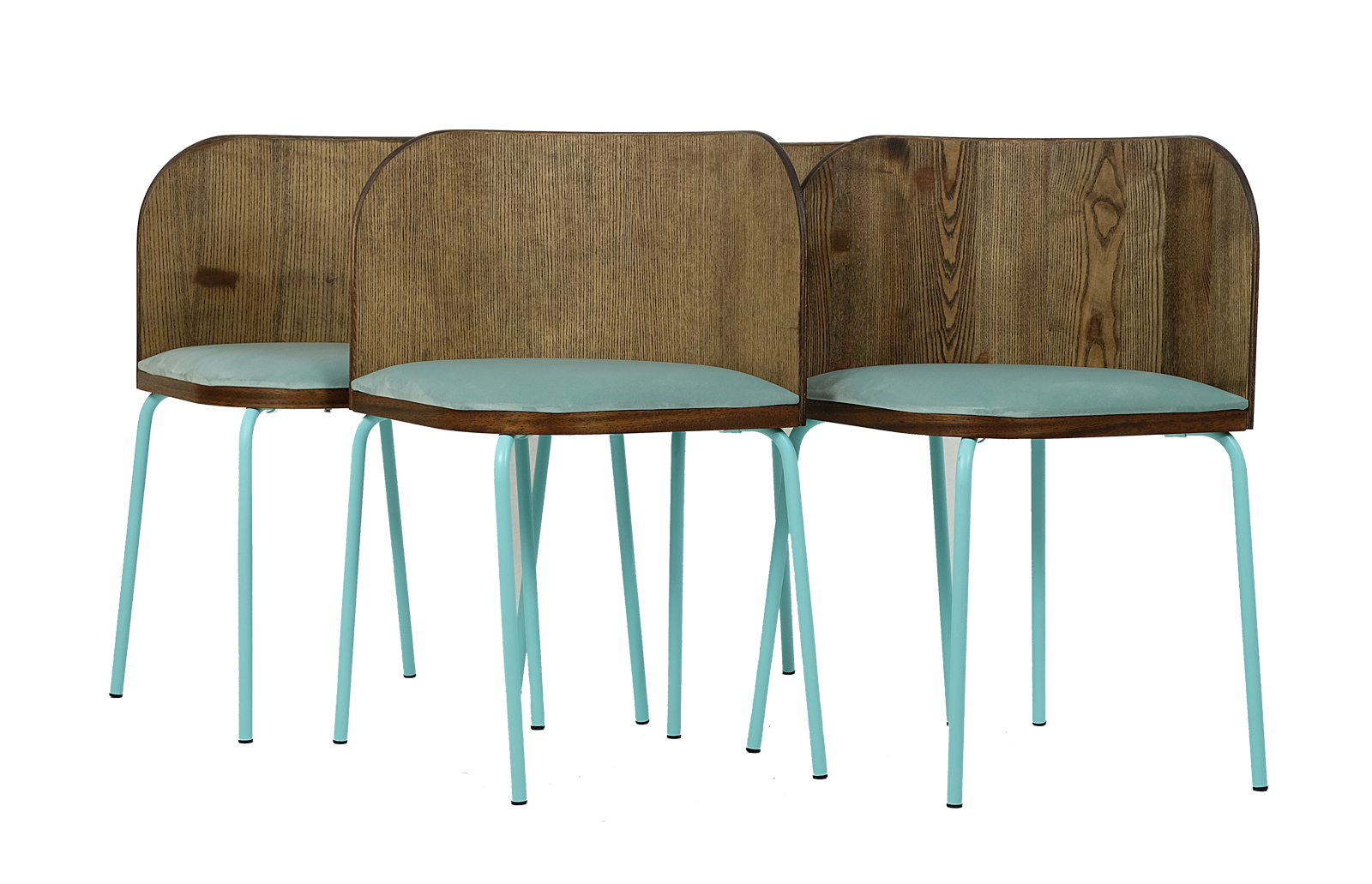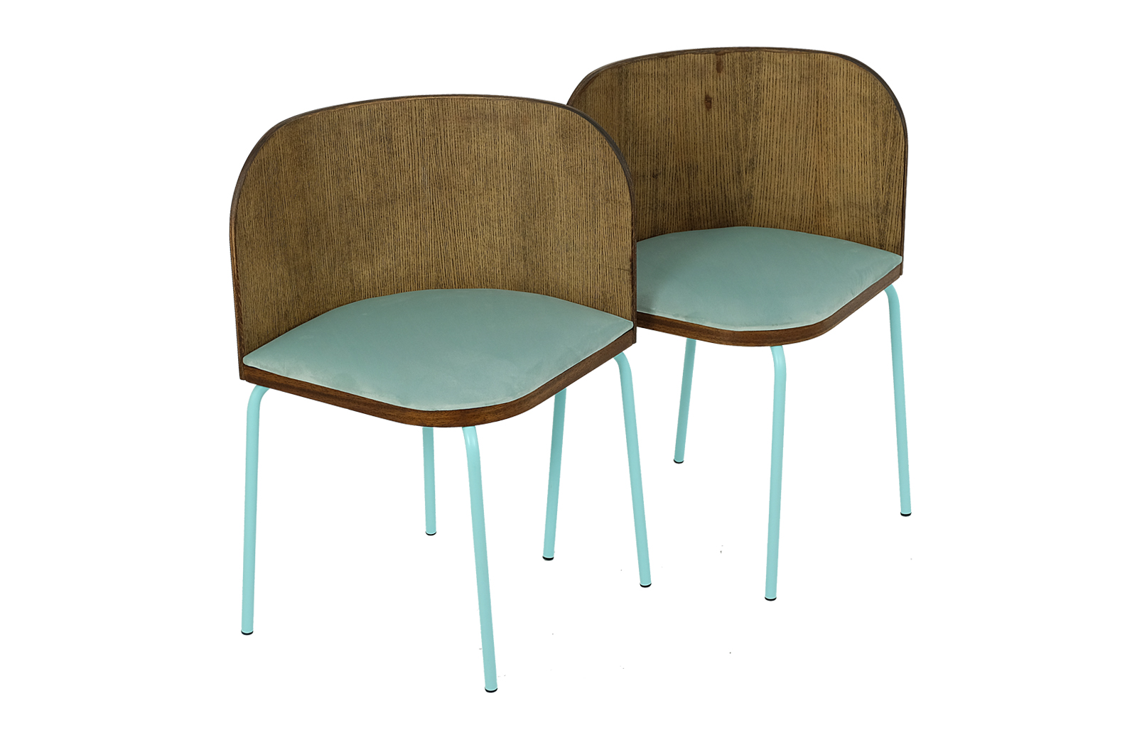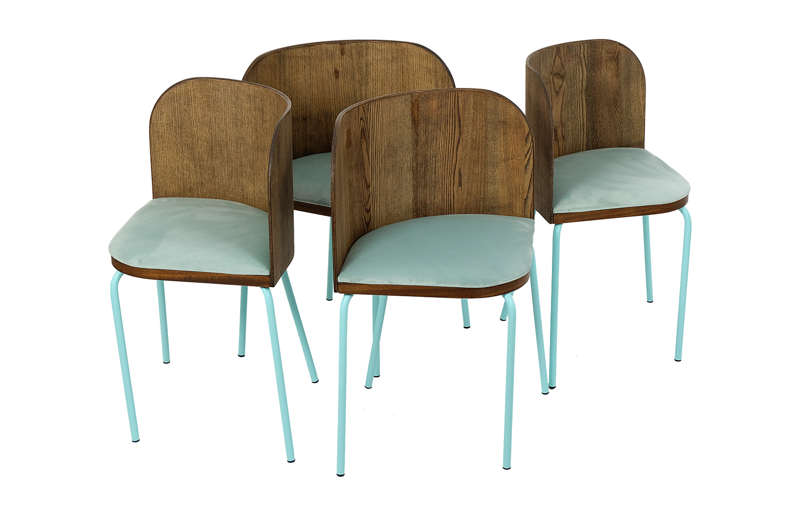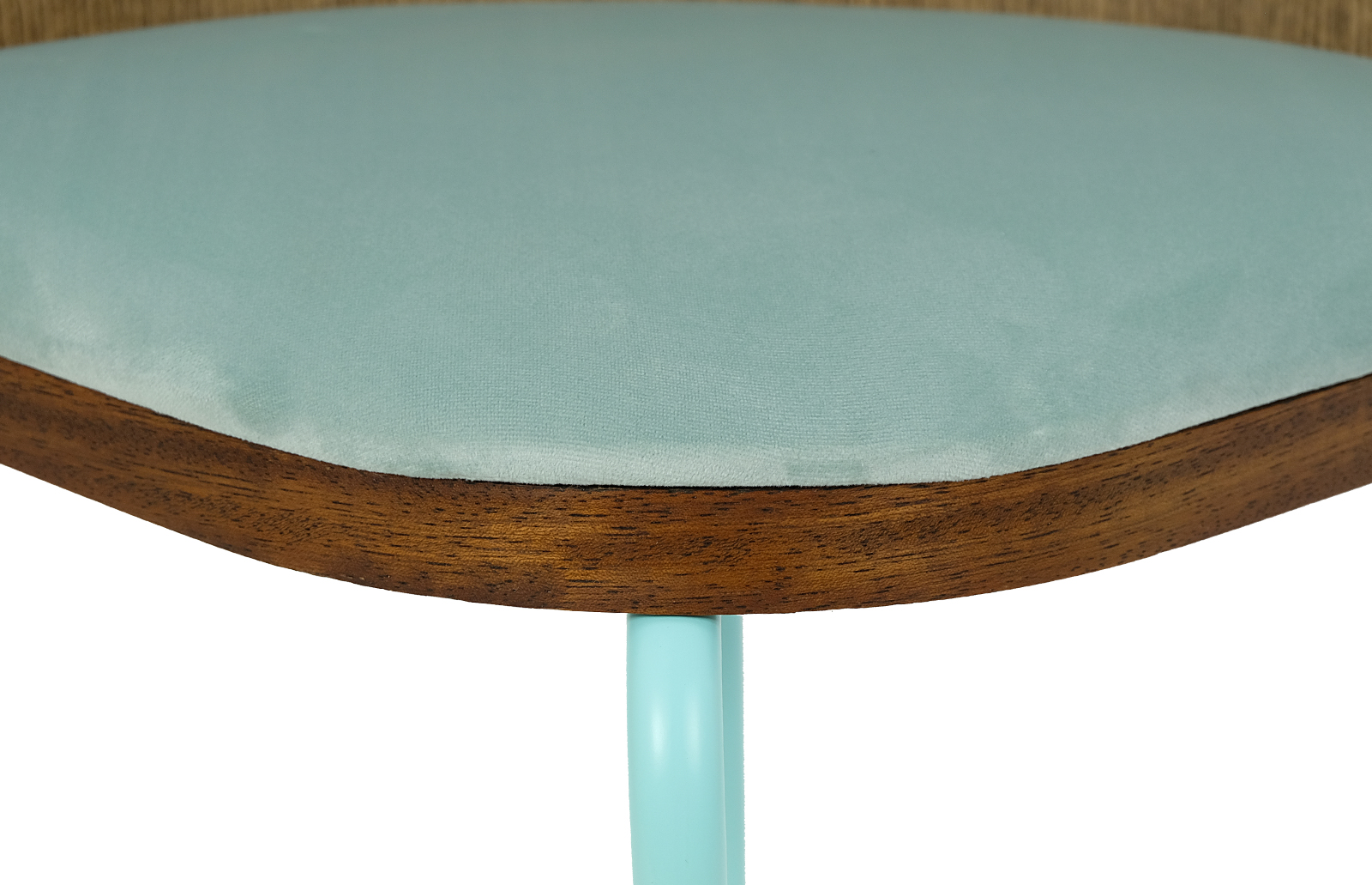 Prezentowane krzesła pochodzą z zestawu wykonanego ze sklejki jesionowej. Drewno zostało oczyszczone ze starych powłok i zabezpieczone olejem na bazie naturalnych olei chińskich, przyjaznym dla środowiska. Twarde siedzisko (0,5 cm wysokości) zostało wymienione. Nowa wysokiej gęstości gąbka (3 cm wysokości) i dobrej jakości pastelowa tkanina podkreślają piękny dizajn krzeseł, a przede wszystkim sprawiają, że siedzi się na nich z przyjemnością. Metalowe nóżki zostały oczyszczone ze starych powłok, a następnie pomalowane przy użyciu samochodowej techniki lakierniczej „na mokro”. Użyto lakieru w kolorze miętowym pastelowym (świetnie współgrającym z tapicerką) i zabezpieczono go bezbarwnym lakierem matowym.