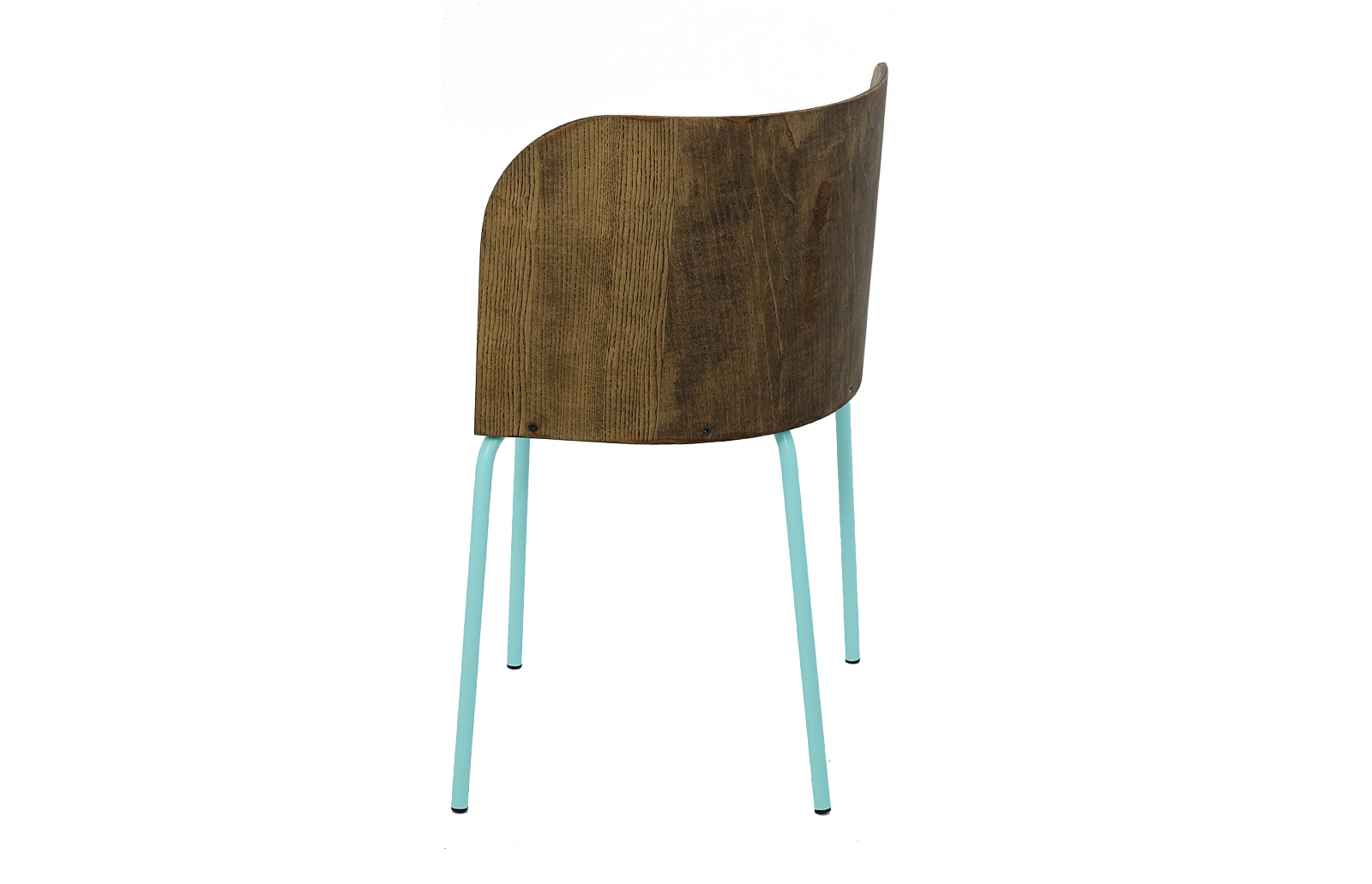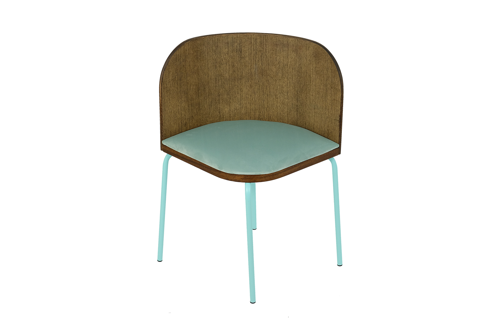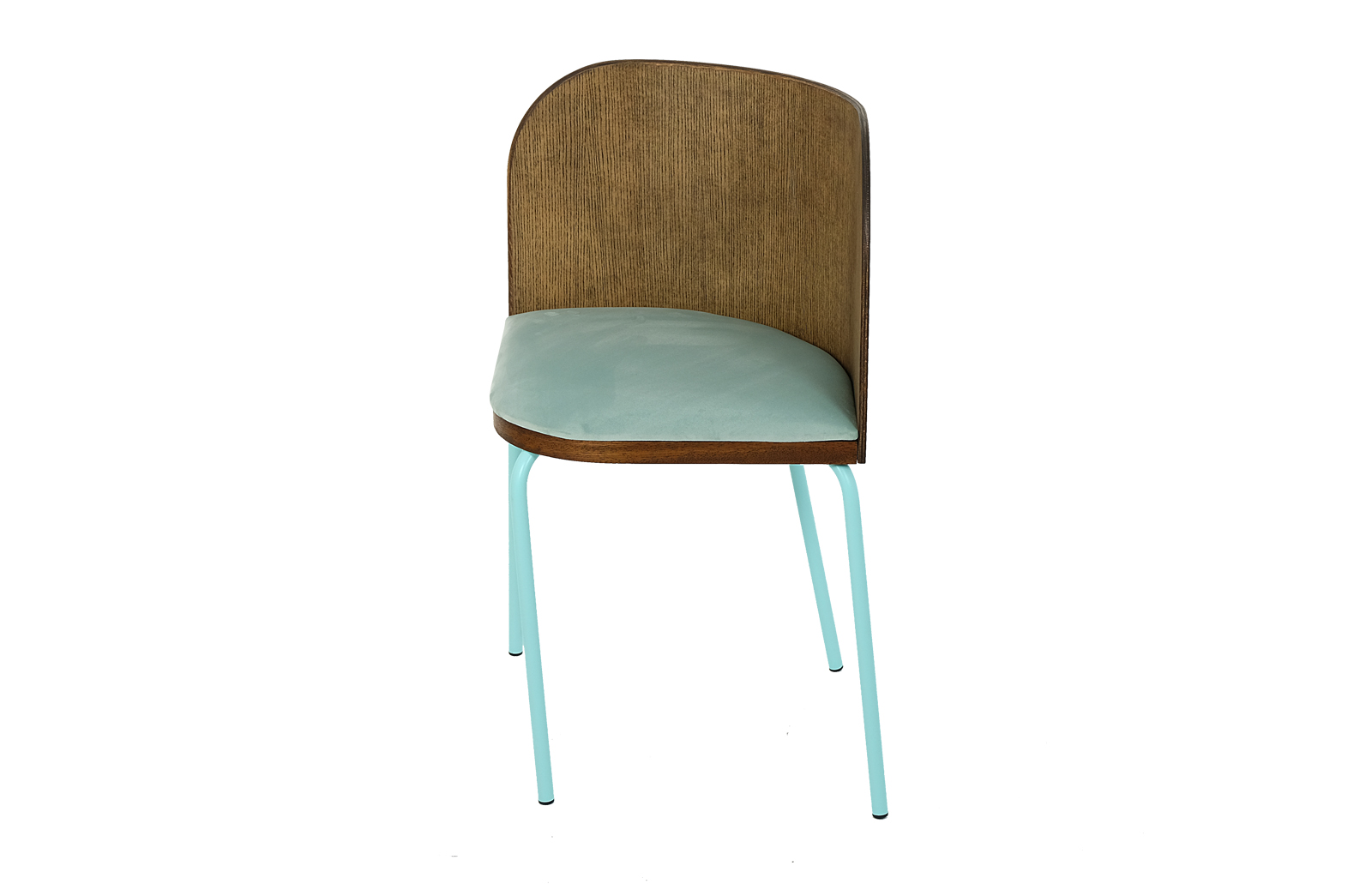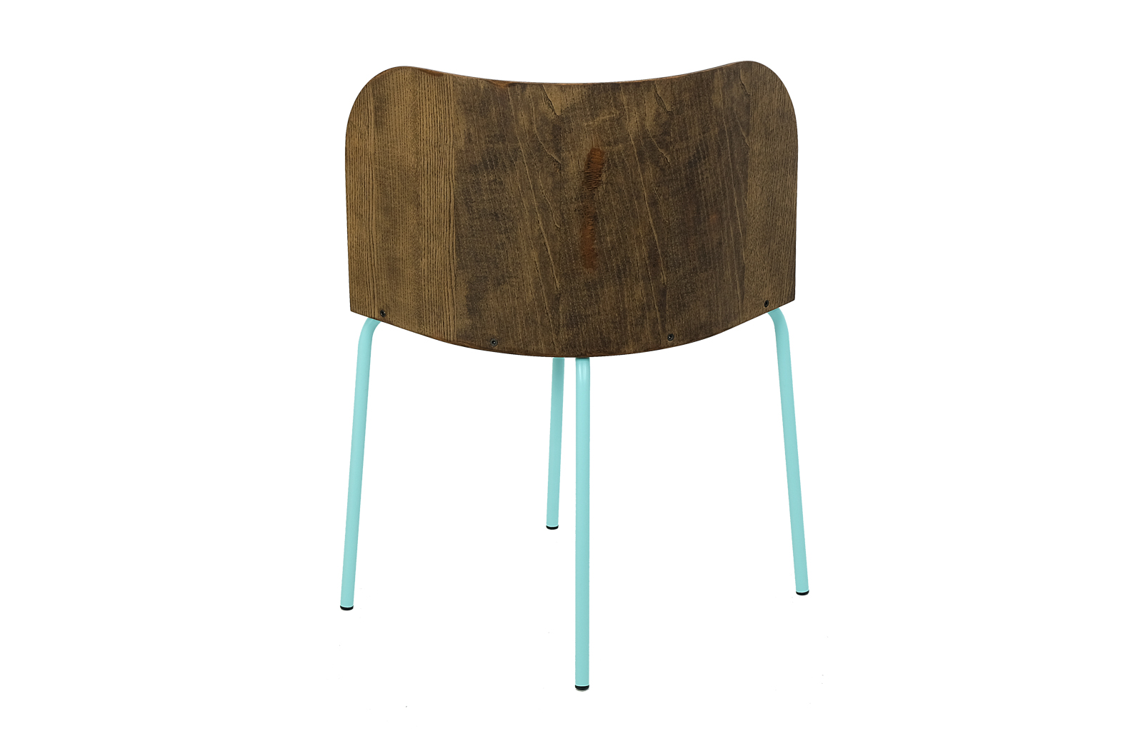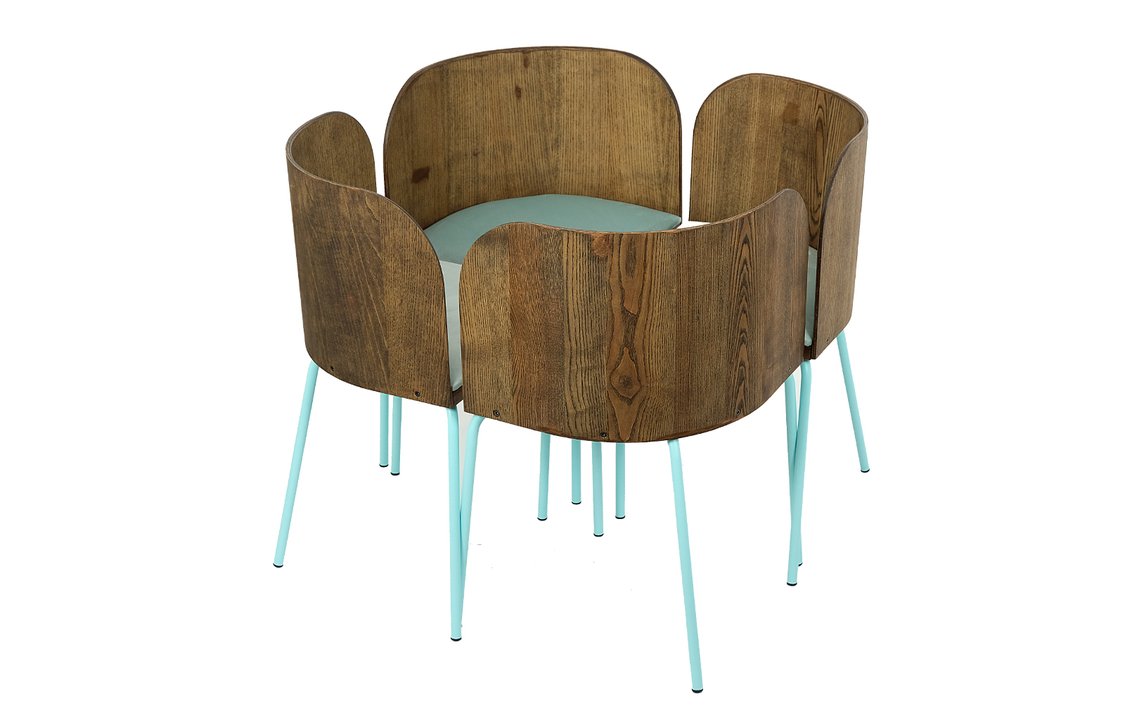 Prezentowane krzesła pochodzą z zestawu wykonanego ze sklejki jesionowej. Drewno zostało oczyszczone ze starych powłok i zabezpieczone olejem na bazie naturalnych olei chińskich, przyjaznym dla środowiska. Twarde siedzisko (0,5 cm wysokości) zostało wymienione. Nowa wysokiej gęstości gąbka (3 cm wysokości) i dobrej jakości pastelowa tkanina podkreślają piękny dizajn krzeseł, a przede wszystkim sprawiają, że siedzi się na nich z przyjemnością. Metalowe nóżki zostały oczyszczone ze starych powłok, a następnie pomalowane przy użyciu samochodowej techniki lakierniczej „na mokro”. Użyto lakieru w kolorze miętowym pastelowym (świetnie współgrającym z tapicerką) i zabezpieczono go bezbarwnym lakierem matowym.