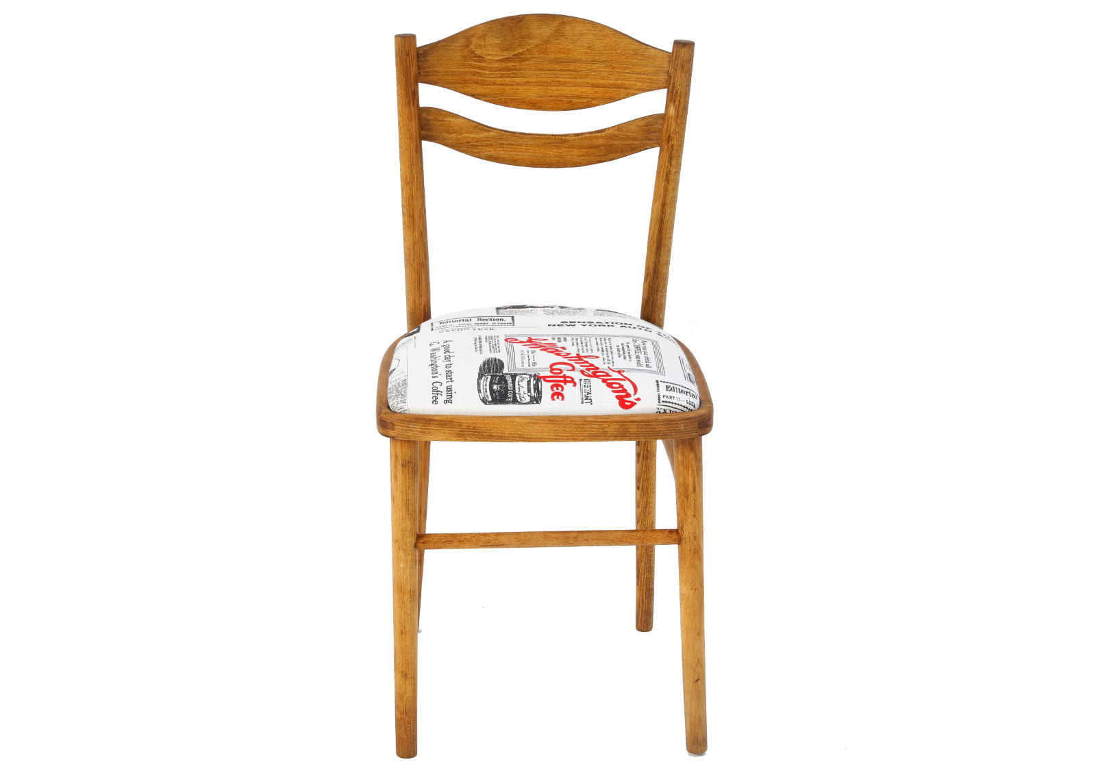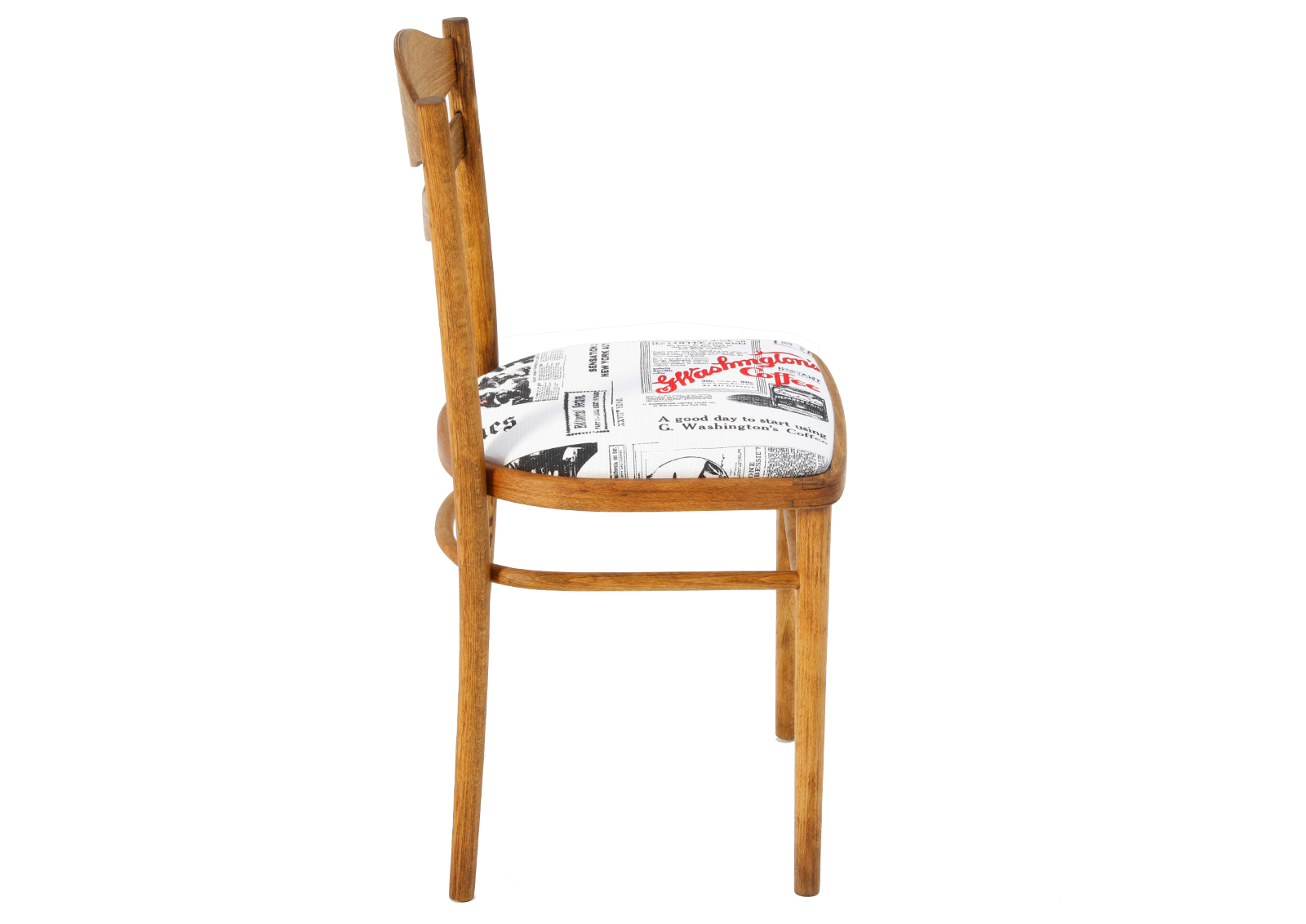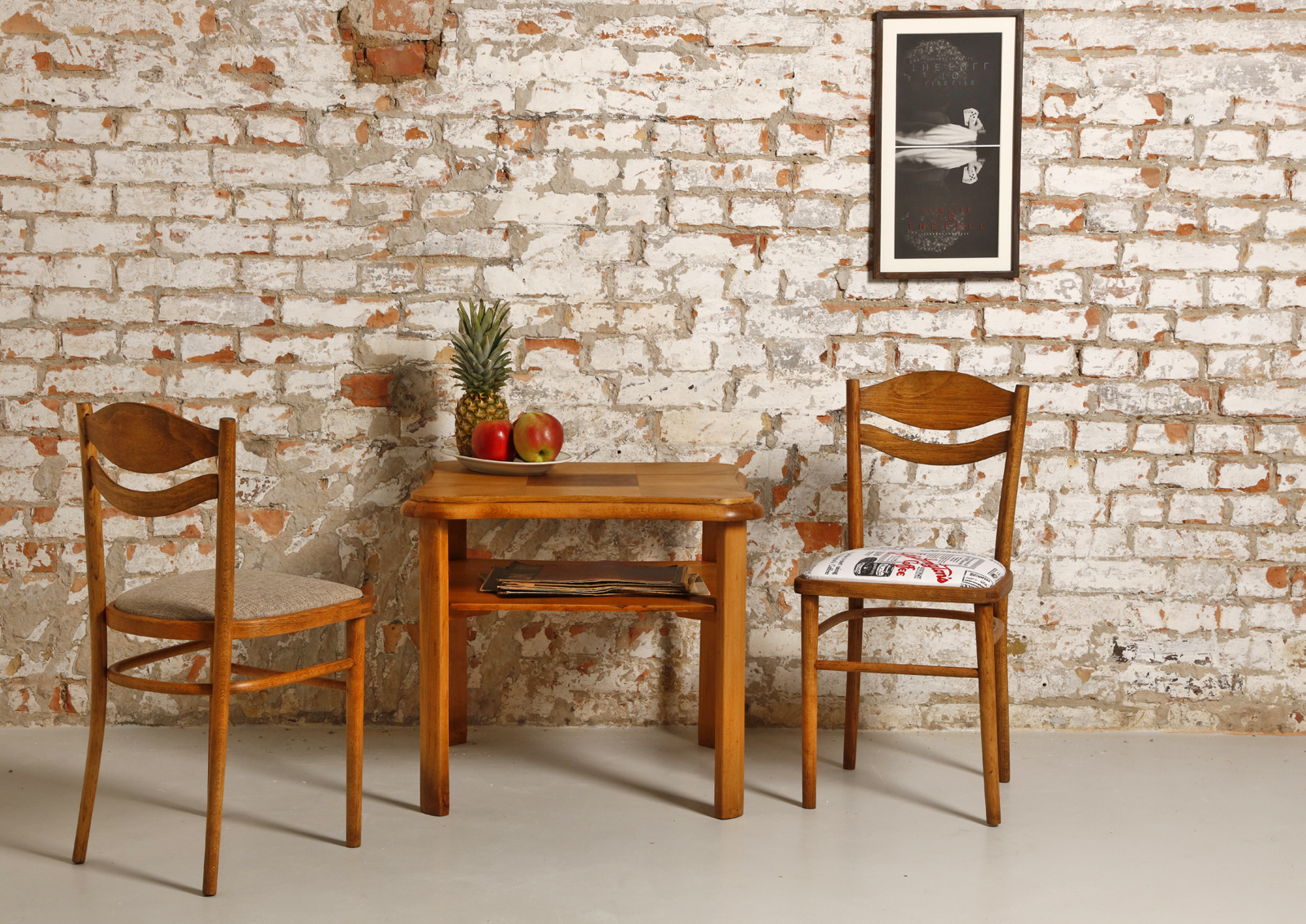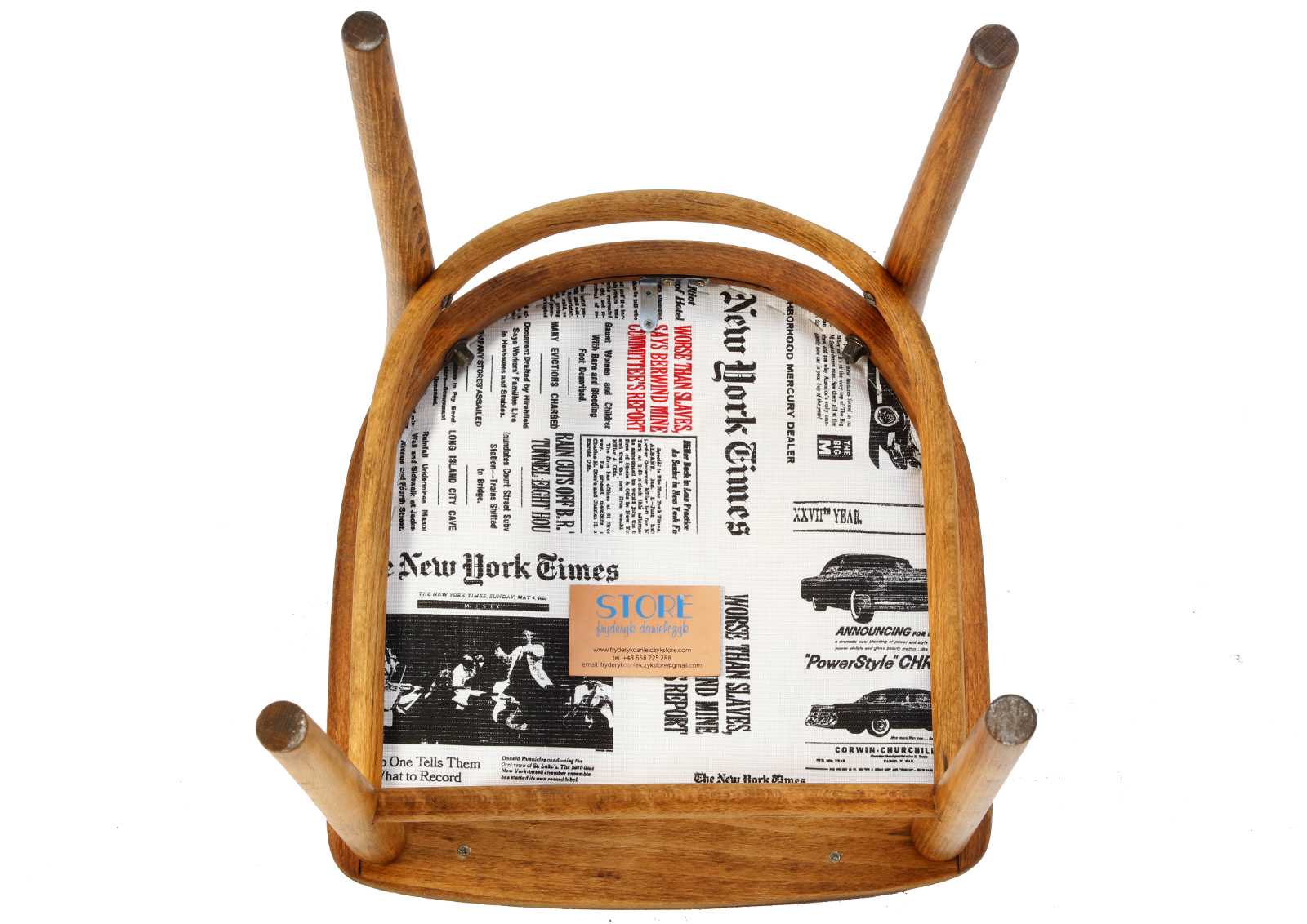 Krzesło PRL model 7556, po całkowitej rewitalizacji. Krzesło zostało całkowicie rozebrane, drewno oczyszczone ze starych powłok, ponownie sklejone, zabezpieczone olejem na bazie naturalnych olei chińskich, przyjaznym dla środowiska. Drewno bukowe. Nowa tapicerka, wymieniona gąbka i siedzisko. Oryginalne oczyszczone metalowe śruby.