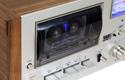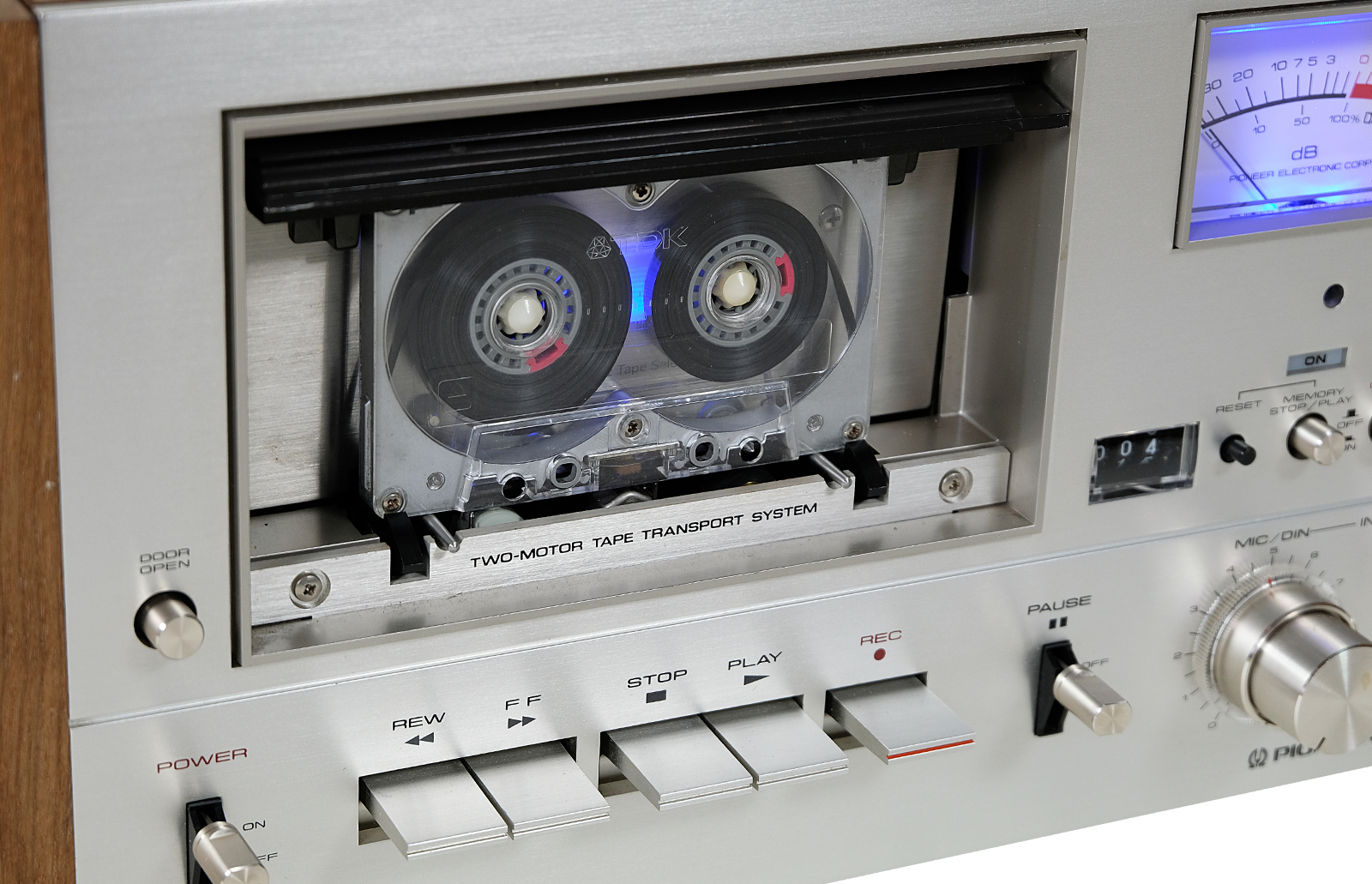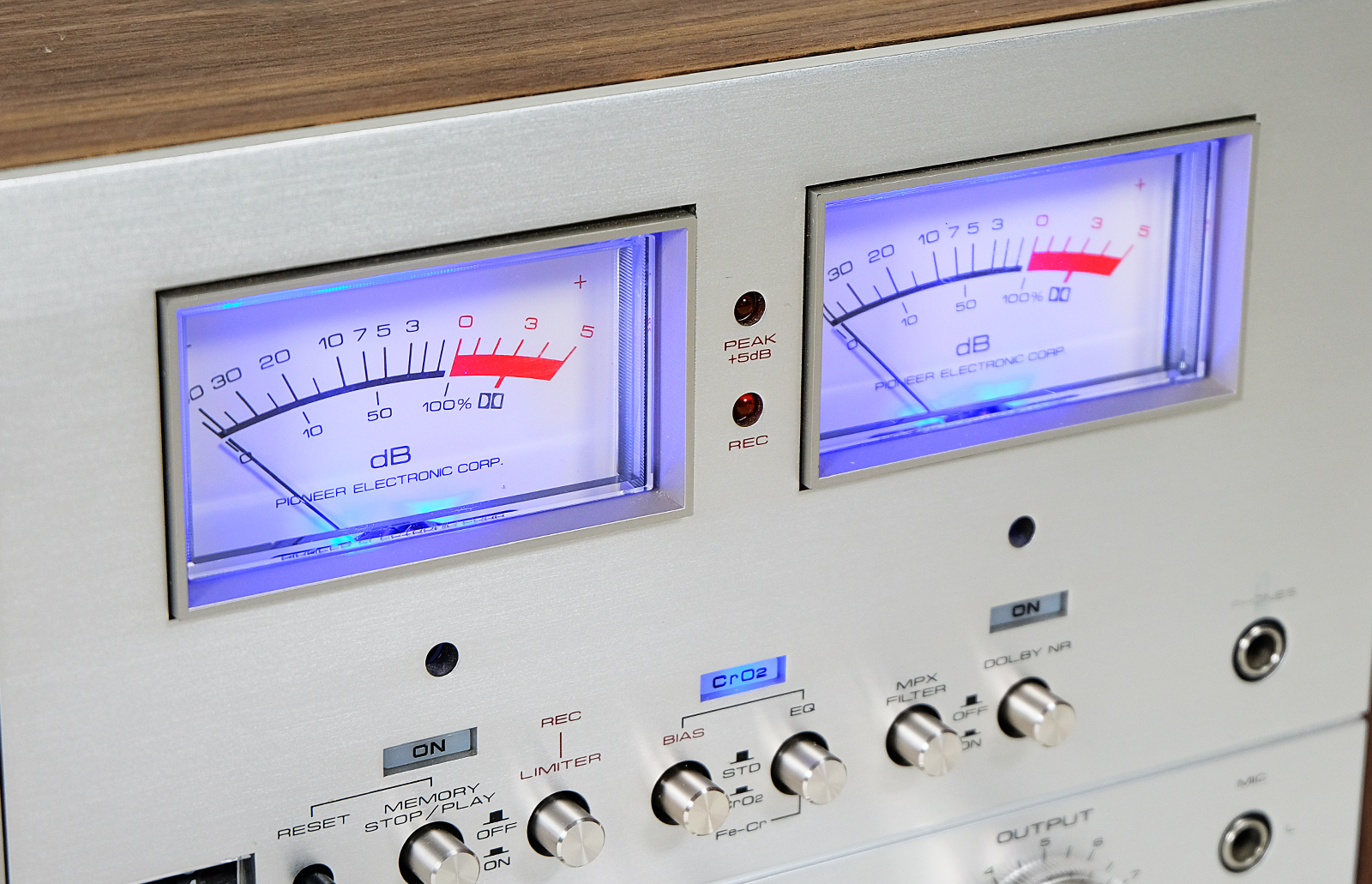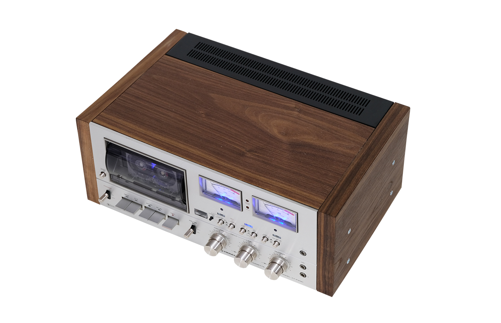 Potencjometry w idealnym stanie. Panel przedni wykonany ze szczotkowanego aluminium. Nowe niebiesko-fioletowe oświetlenie podświetlające kasetę i wskaźniki.