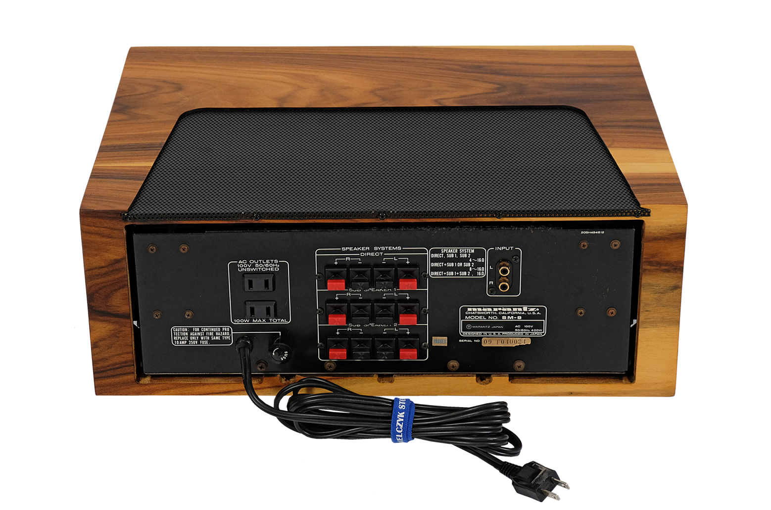 SM-9 to flagowy wzmacniacz mocy stereofonicznej marki Marantz z początku lat 80, zaprojektowany jako idealne uzupełnienie przedwzmacniacza SC-9. Był szczytowym osiągnięciem inżynierów firmy, łączącym potężną moc z precyzją i muzykalnością charakterystyczną dla konstrukcji Marantza z tamtego okresu. Wzmacniacz oferuje 150 W na kanał przy 8 ohm, oparty jest na pełnym układzie DC i wykorzystuje tranzystory o bardzo wysokiej częstotliwości granicznej, co przekłada się na znakomite parametry w całym paśmie. Zastosowano również technologię Low-TIM, ograniczającą zniekształcenia międzymodulacyjne i zapewniającą naturalne, dynamiczne brzmienie. Konstrukcja z podwójnym transformatorem i dużymi kondensatorami filtrującymi gwarantuje stabilne zasilanie oraz doskonałą separację kanałów. Dopracowane detale – od wysokiej jakości terminali głośnikowych po klasyczny, elegancki panel frontowy – podkreślają charakter tego modelu.