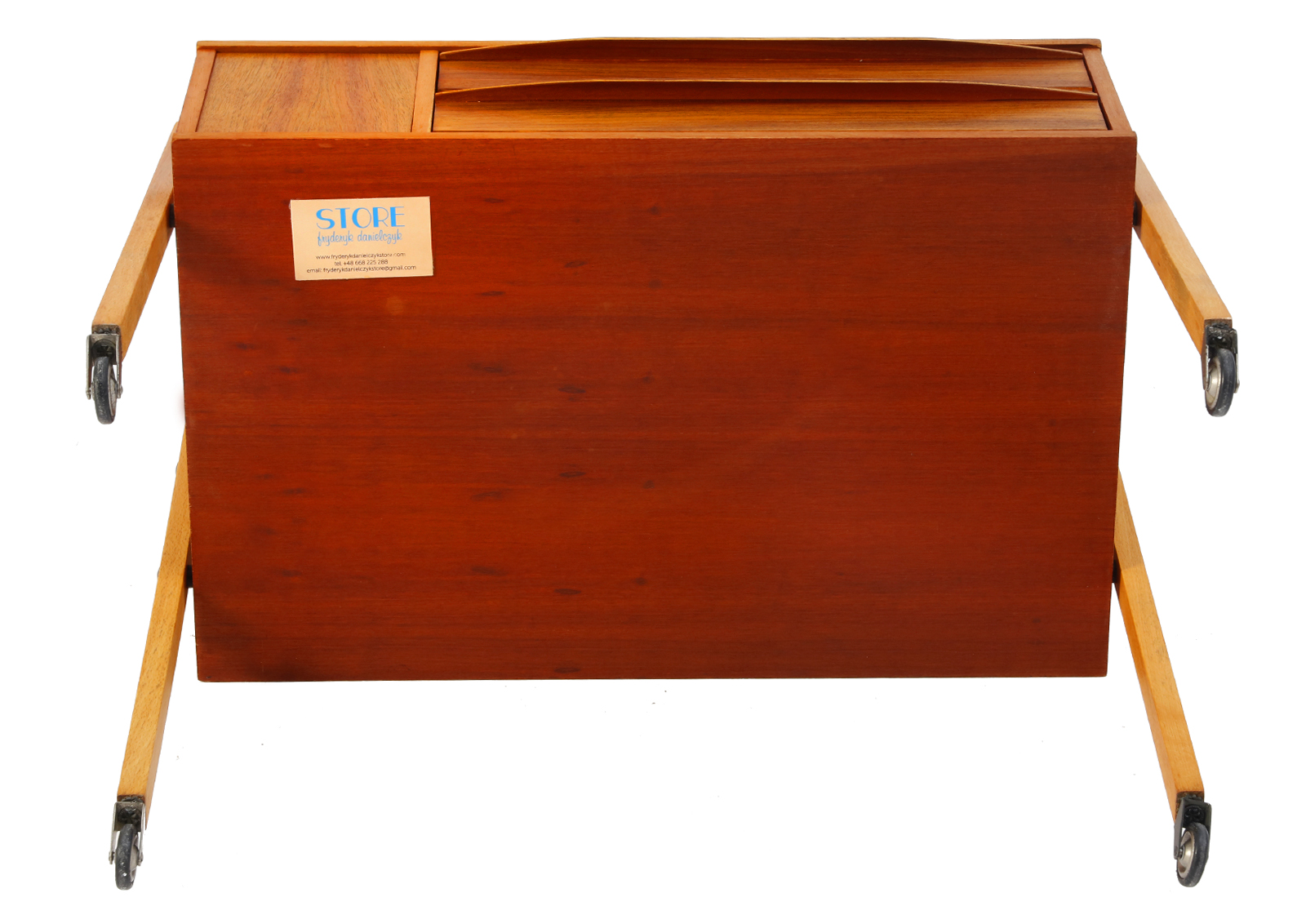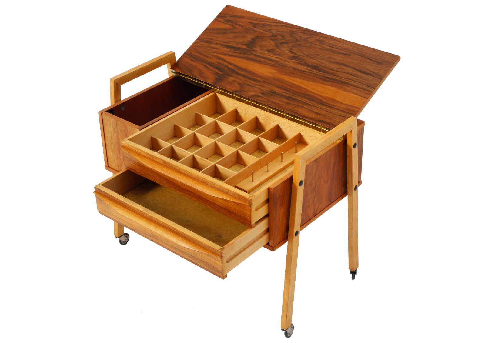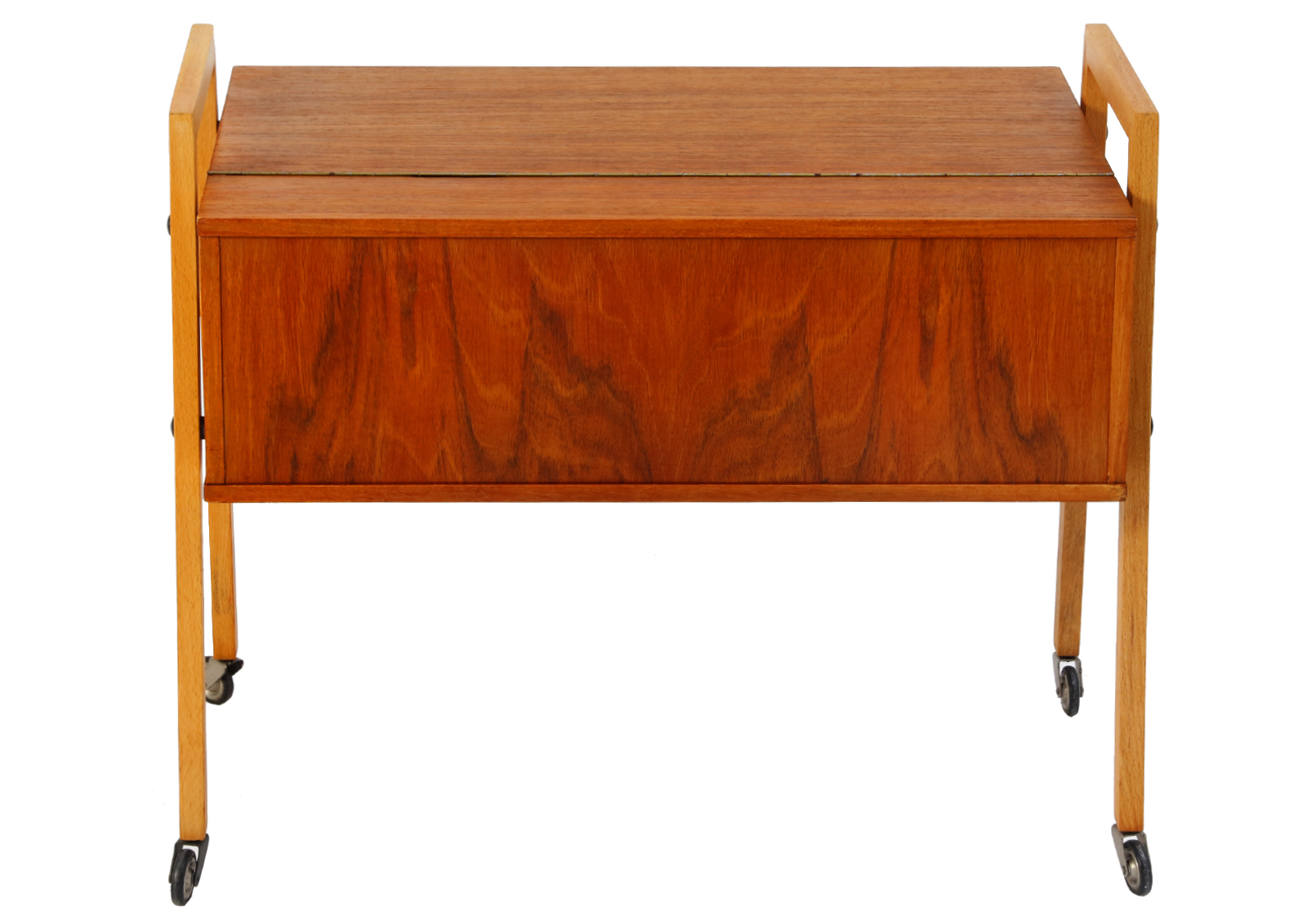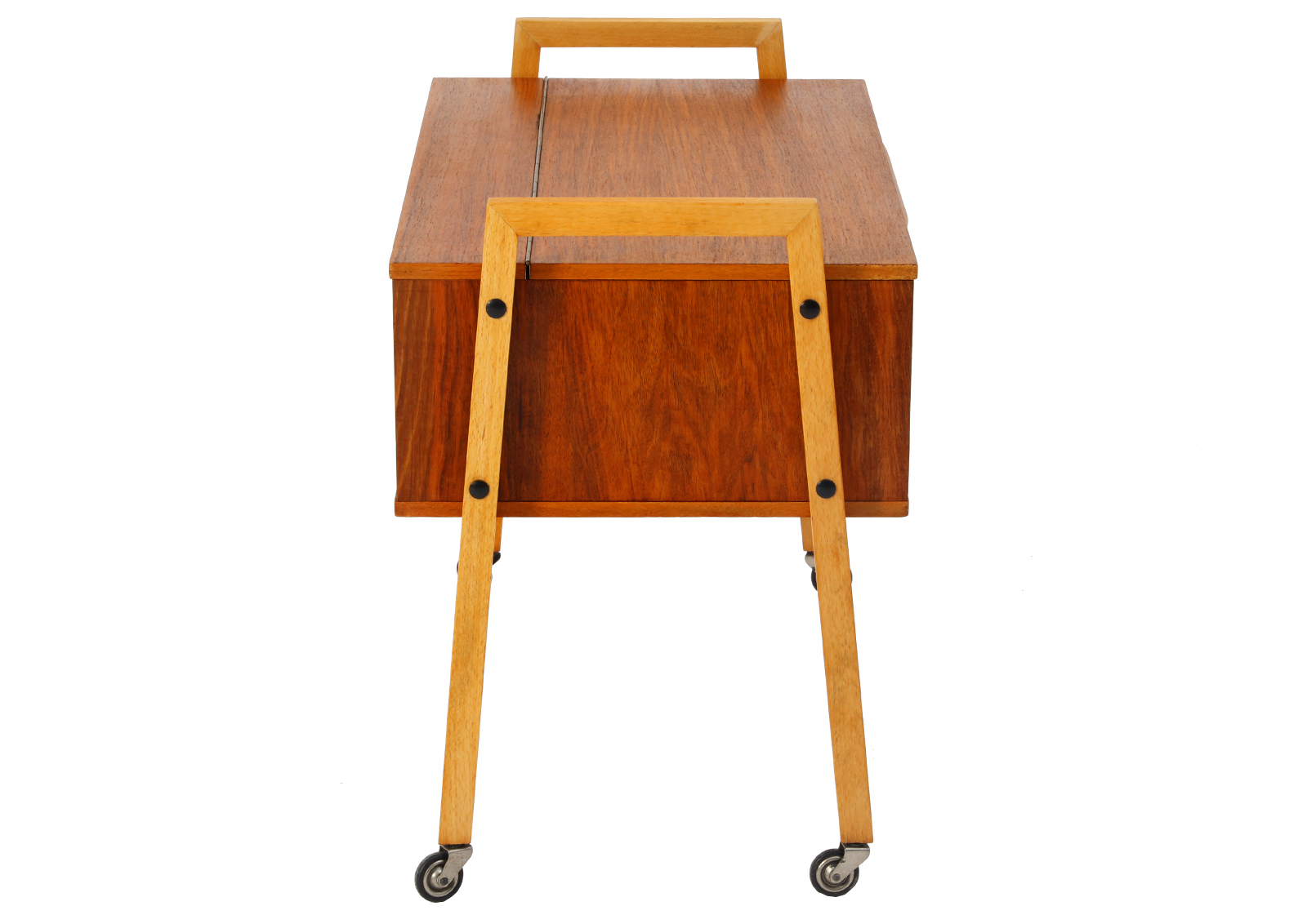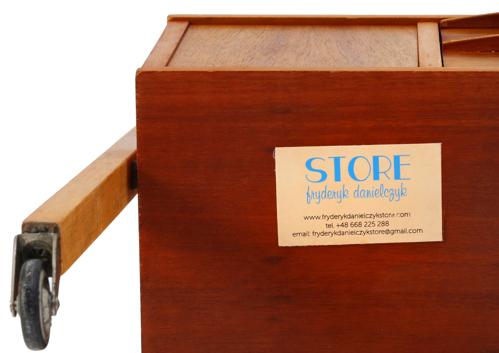 Mobilny, niemiecki niciak lub inaczej pomocnik z lat 60. Niciak został całkowicie oczyszczony ze starych powłok lakierniczych. Fornir orzechowy, nogi wykonane są z drewna bukowego. Zabezpieczony olejem na bazie naturalnych olei chińskich, przyjaznym dla środowiska.