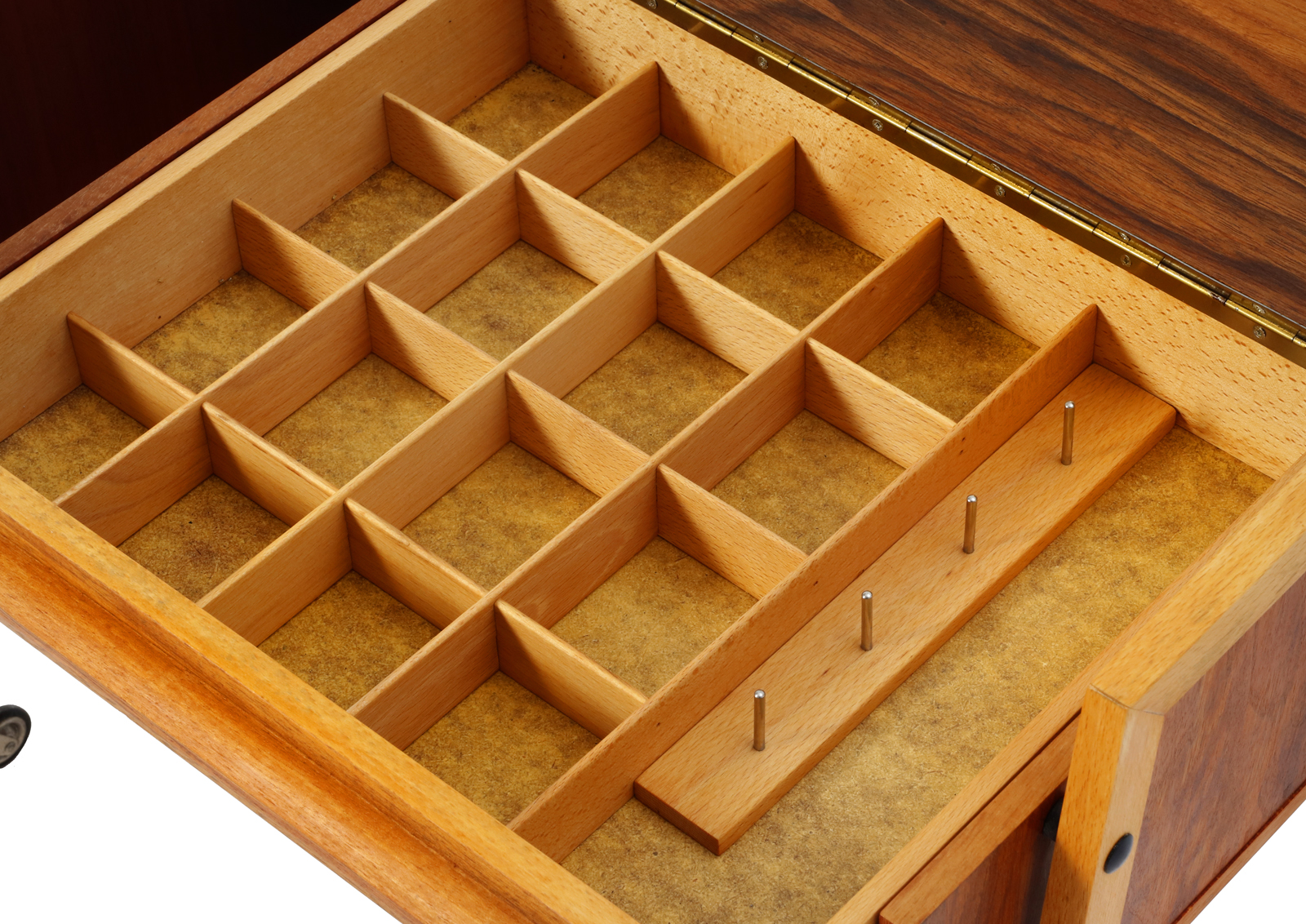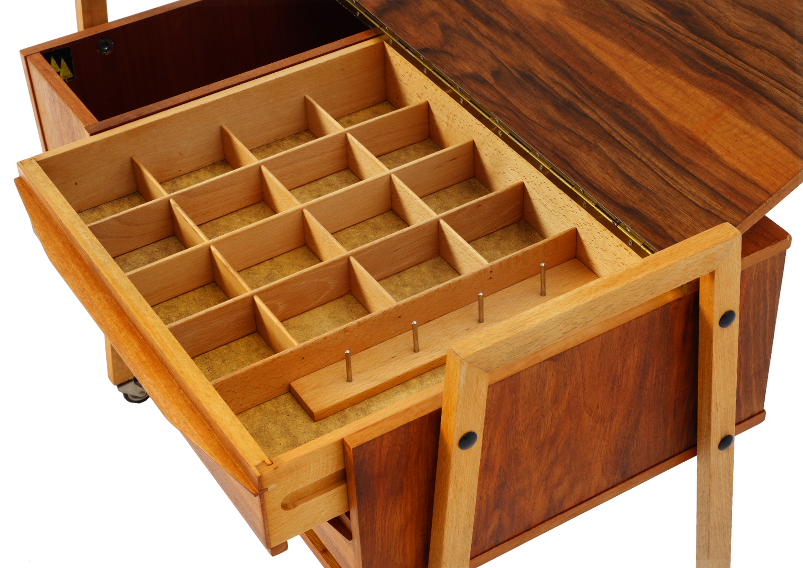 Ma podnoszony blat, dwie szuflady (w tym jedną specjalnie przystosowaną do segregacji małych przedmiotów) i boczny schowek. Wyprodukowany w niemieckim Rudersbergu.