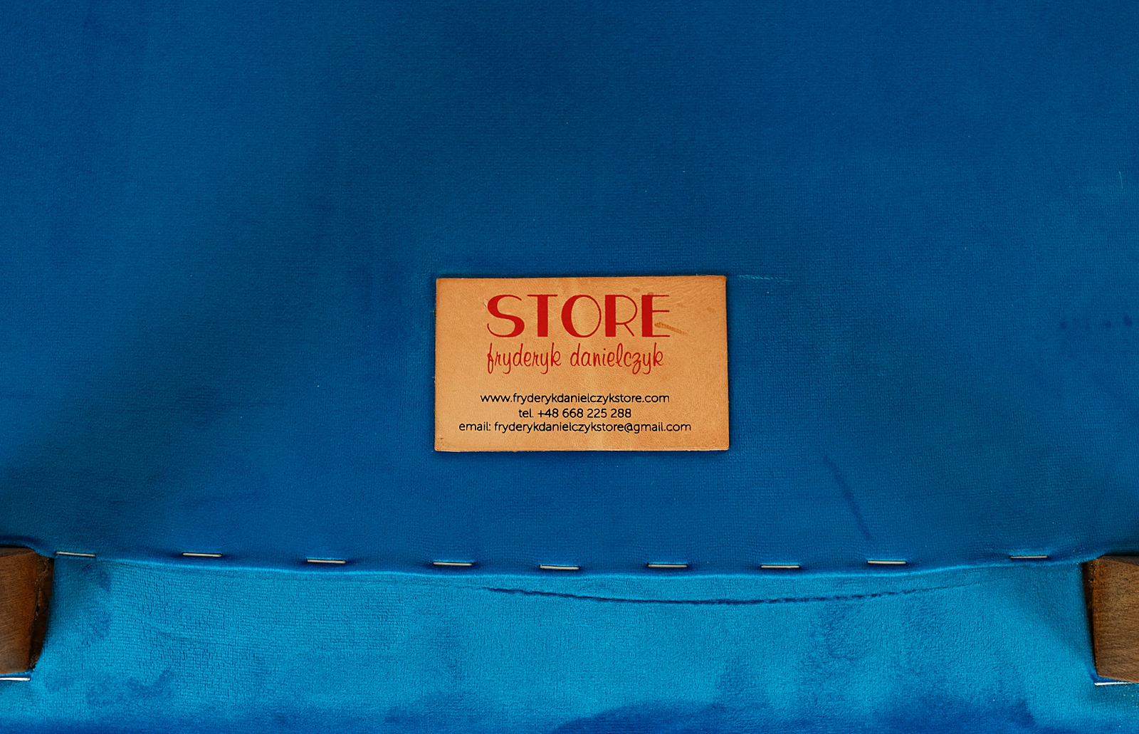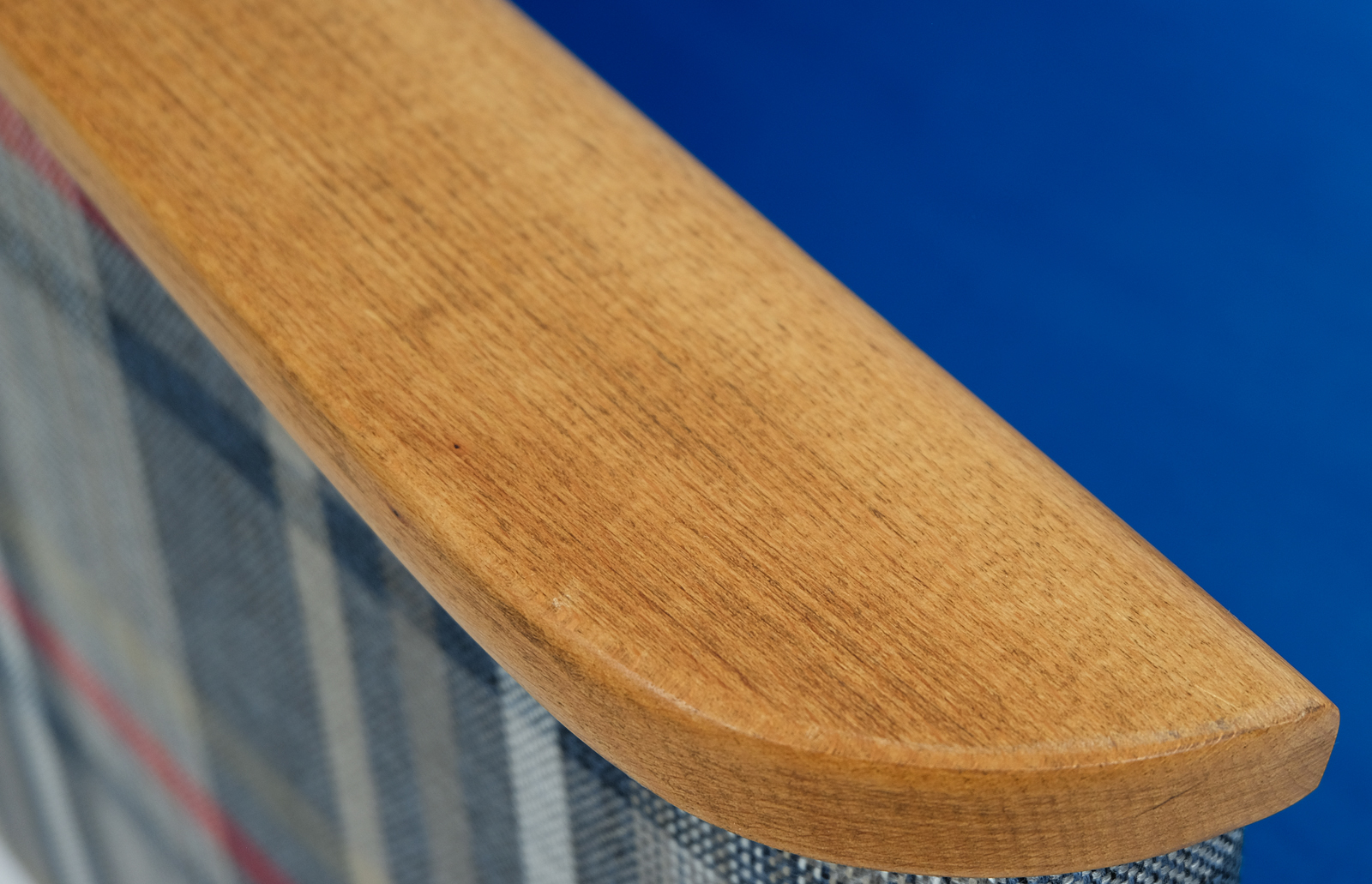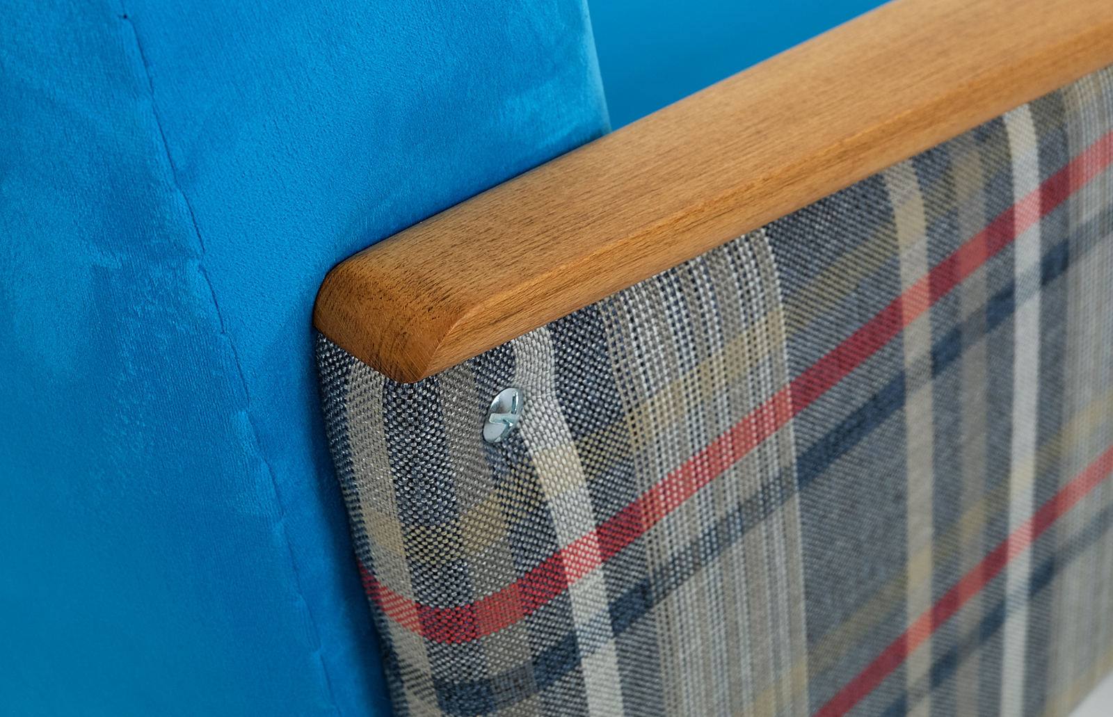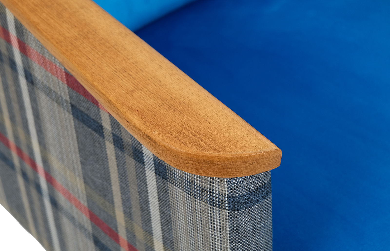 Fotel charakteryzuje się lekko zwężającym się ku górze oparciem i rozszerzającym się siedziskiem. Dokręcane płyty oparć bocznych wyłożone zostały dodatkowo gąbką. Fotele zostały całkowicie rozebrane, drewno oczyszczone ze starych powłok lakierniczych, sklejone ponownie, zabezpieczone olejem na bazie naturalnych olei chińskich, przyjaznym dla środowiska. Drewno bukowe. Nowa tapicerka, wymieniona gąbka, pasy, fizelina. Ręcznie szyty. Bardzo dobrej jakości tkanina, odporność na ścieranie 30 000 suwów. Nowe metalowe śruby.