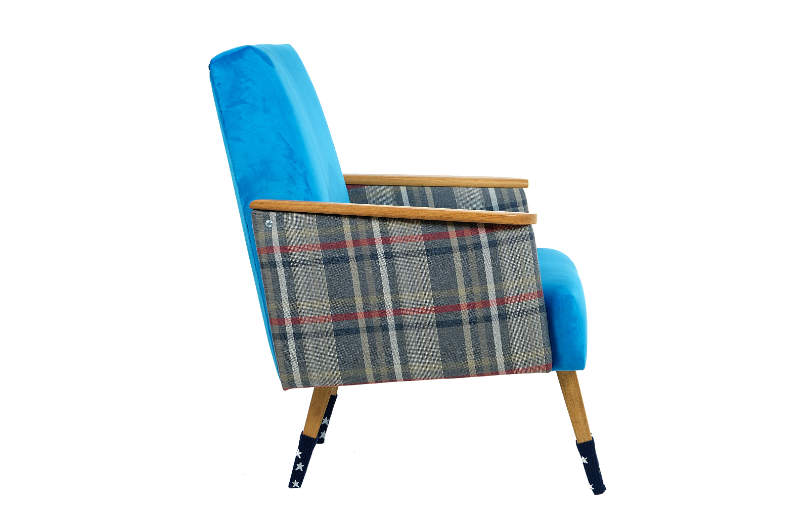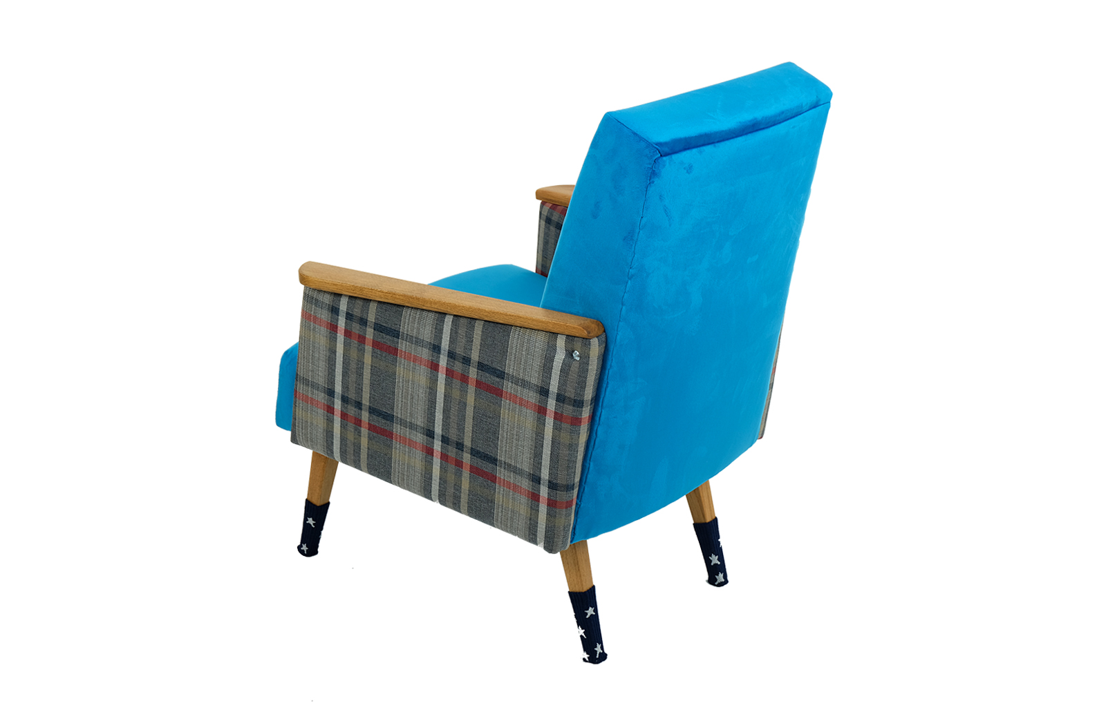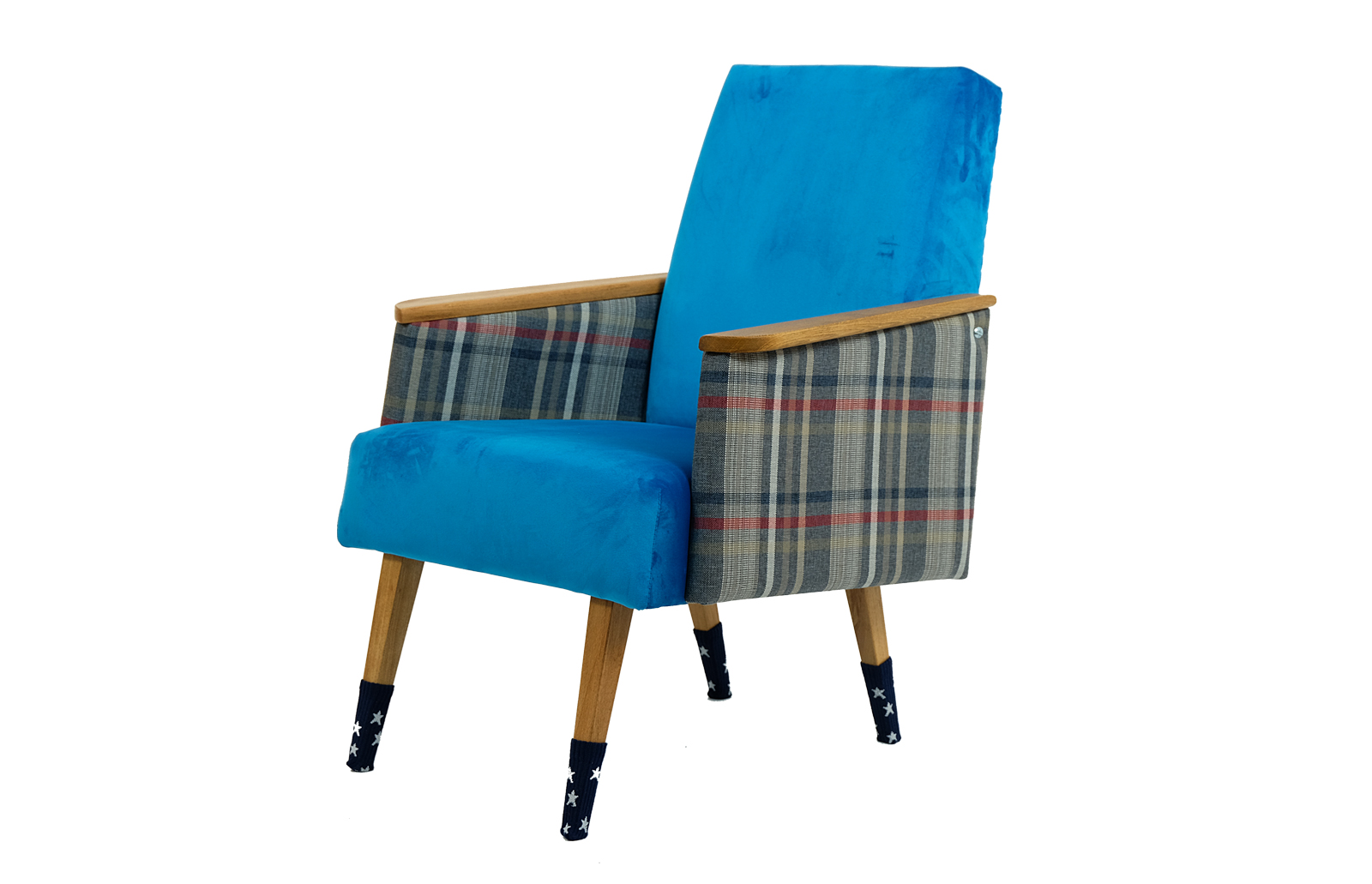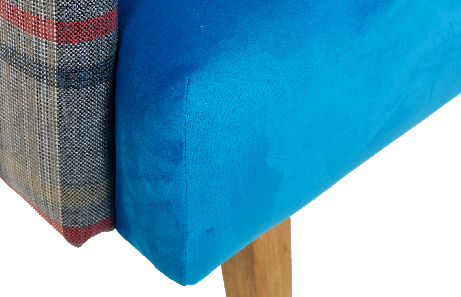 Fotel charakteryzuje się lekko zwężającym się ku górze oparciem i rozszerzającym się siedziskiem. Dokręcane płyty oparć bocznych wyłożone zostały dodatkowo gąbką. Fotele zostały całkowicie rozebrane, drewno oczyszczone ze starych powłok lakierniczych, sklejone ponownie, zabezpieczone olejem na bazie naturalnych olei chińskich, przyjaznym dla środowiska. Drewno bukowe. Nowa tapicerka, wymieniona gąbka, pasy, fizelina. Ręcznie szyty. Bardzo dobrej jakości tkanina, odporność na ścieranie 30 000 suwów. Nowe metalowe śruby.