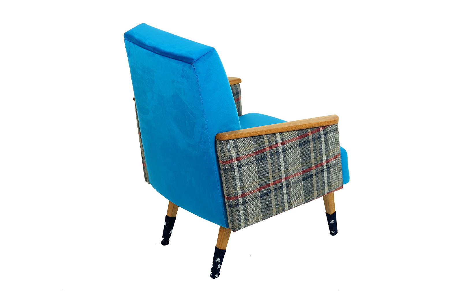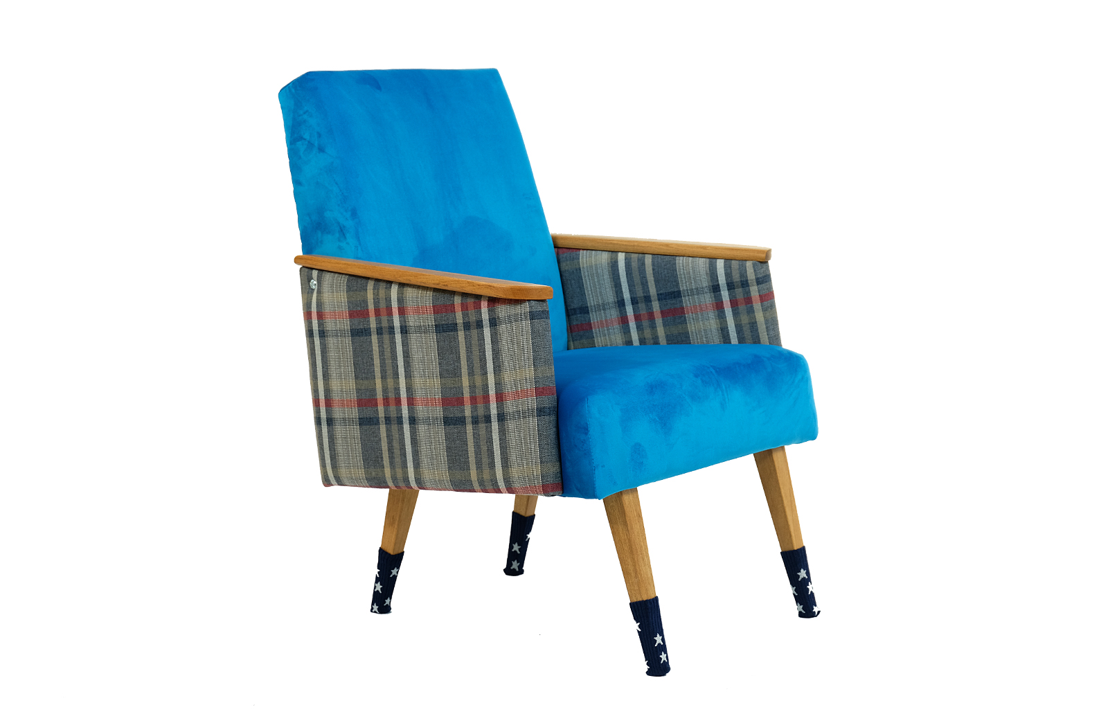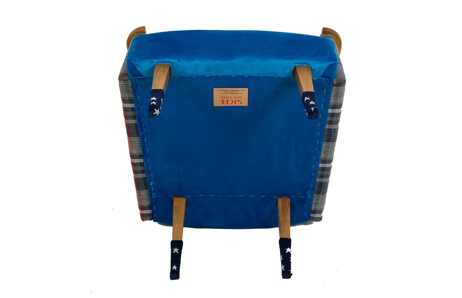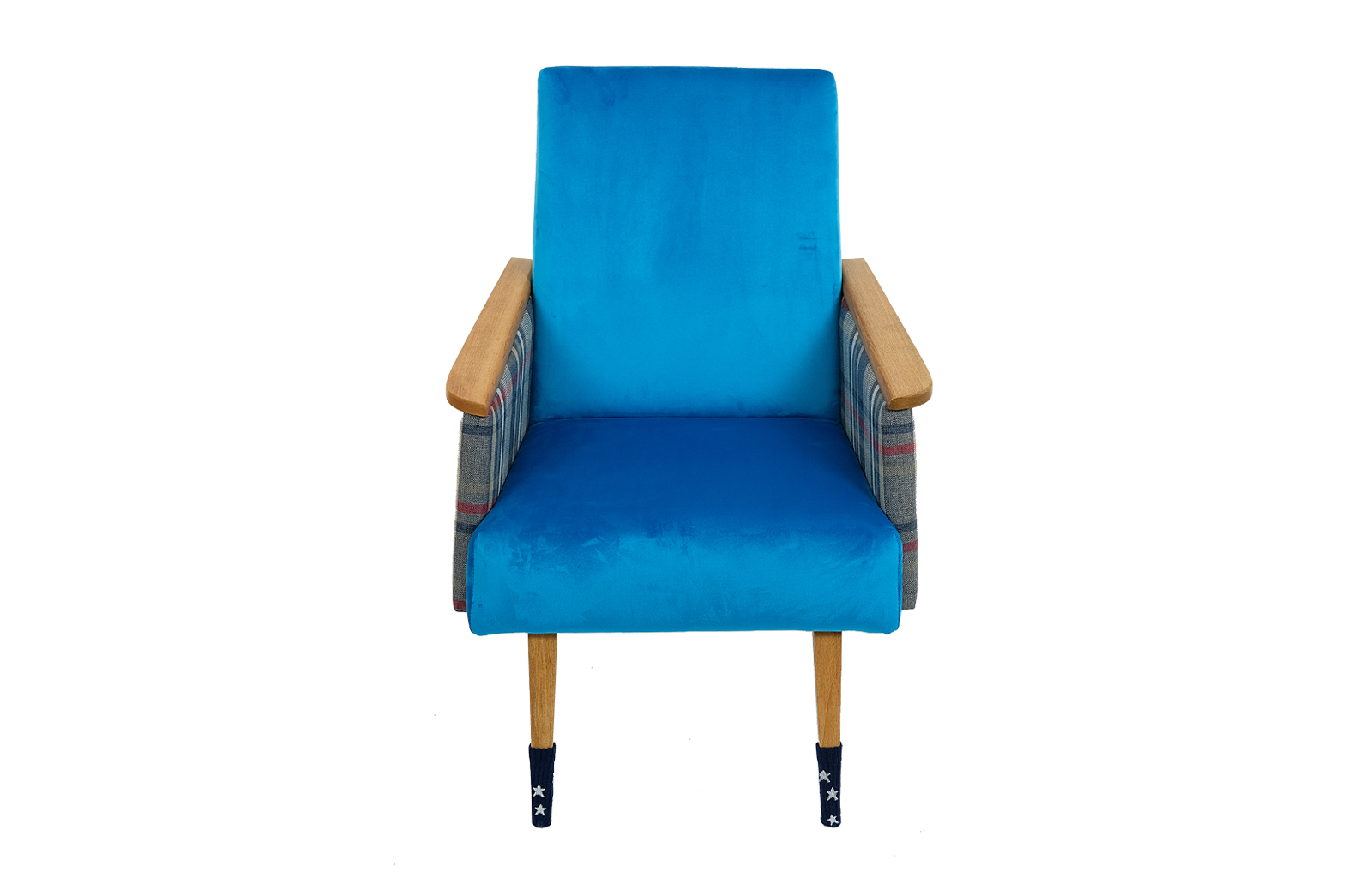 Fotel charakteryzuje się lekko zwężającym się ku górze oparciem i rozszerzającym się siedziskiem. Dokręcane płyty oparć bocznych wyłożone zostały dodatkowo gąbką. Fotele zostały całkowicie rozebrane, drewno oczyszczone ze starych powłok lakierniczych, sklejone ponownie, zabezpieczone olejem na bazie naturalnych olei chińskich, przyjaznym dla środowiska. Drewno bukowe. Nowa tapicerka, wymieniona gąbka, pasy, fizelina. Ręcznie szyty. Bardzo dobrej jakości tkanina, odporność na ścieranie 30 000 suwów. Nowe metalowe śruby.