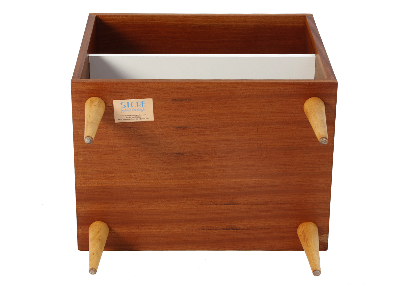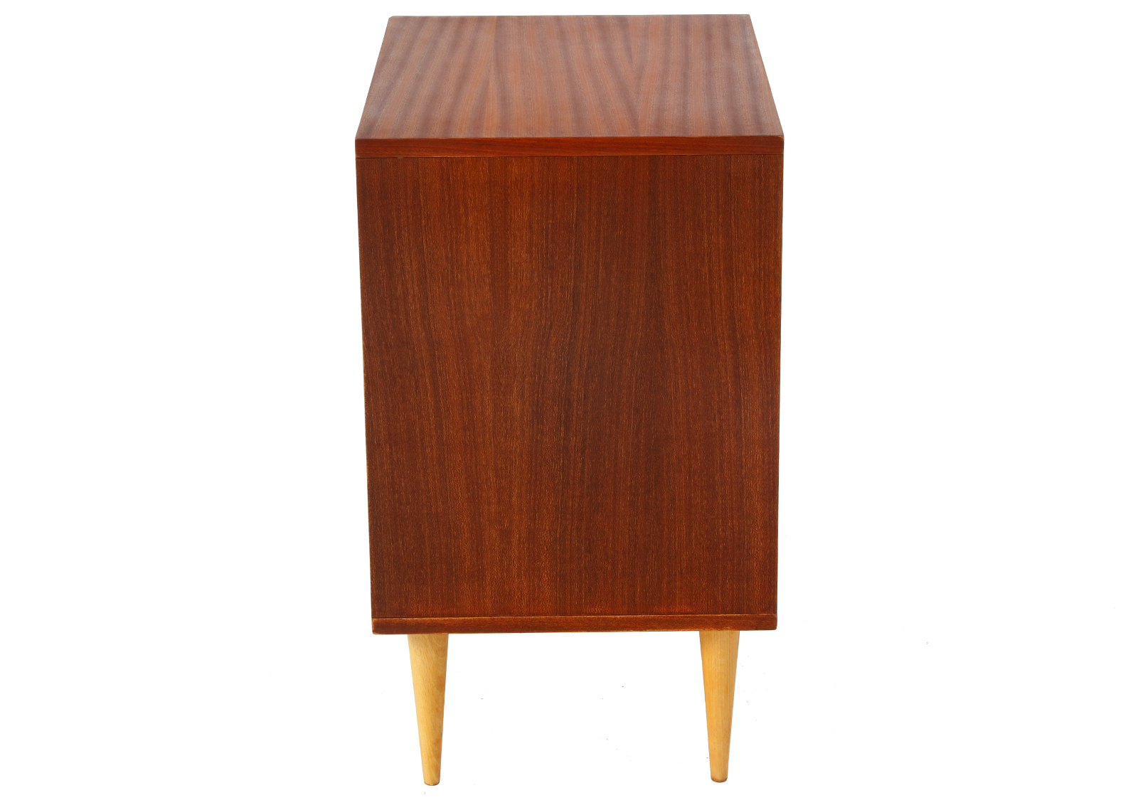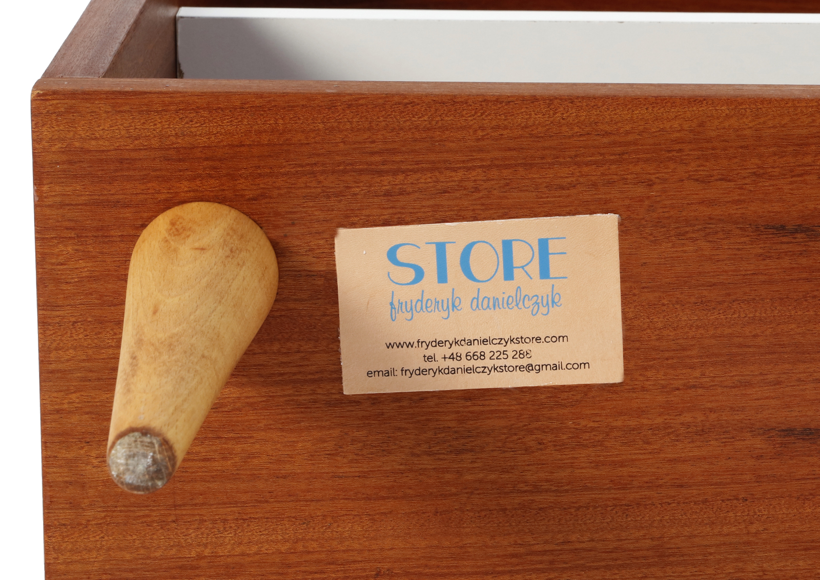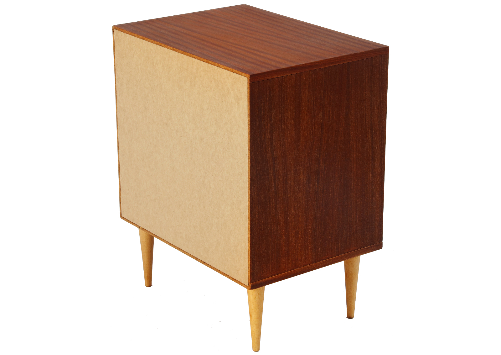 Szafka RTV W-465/N-I/3, po całkowitej rewitalizacji. Szafka została całkowicie oczyszczona ze starych powłok lakierniczych. Oklejona mahoniem, nogi bukowe. Zabezpieczona olejem na bazie naturalnych olei chińskich, przyjaznym dla środowiska. Nowa tylna ściana z płyty pilśniowej.