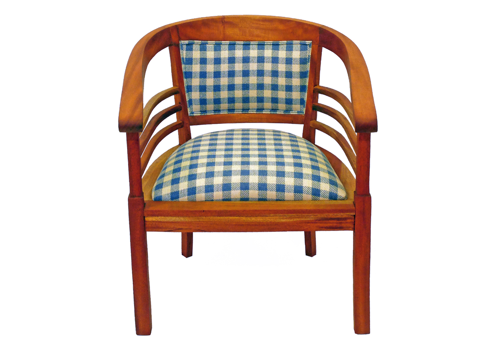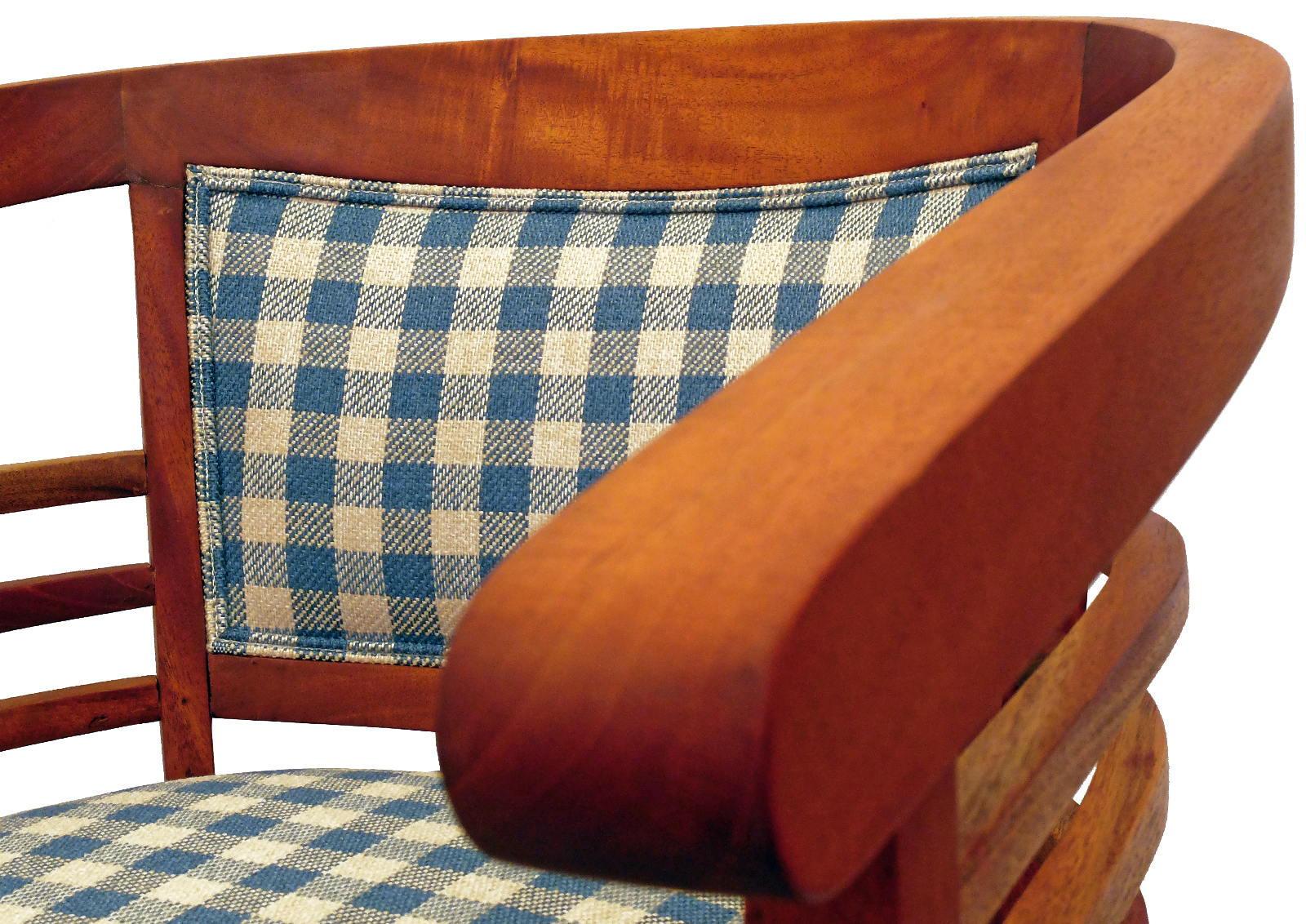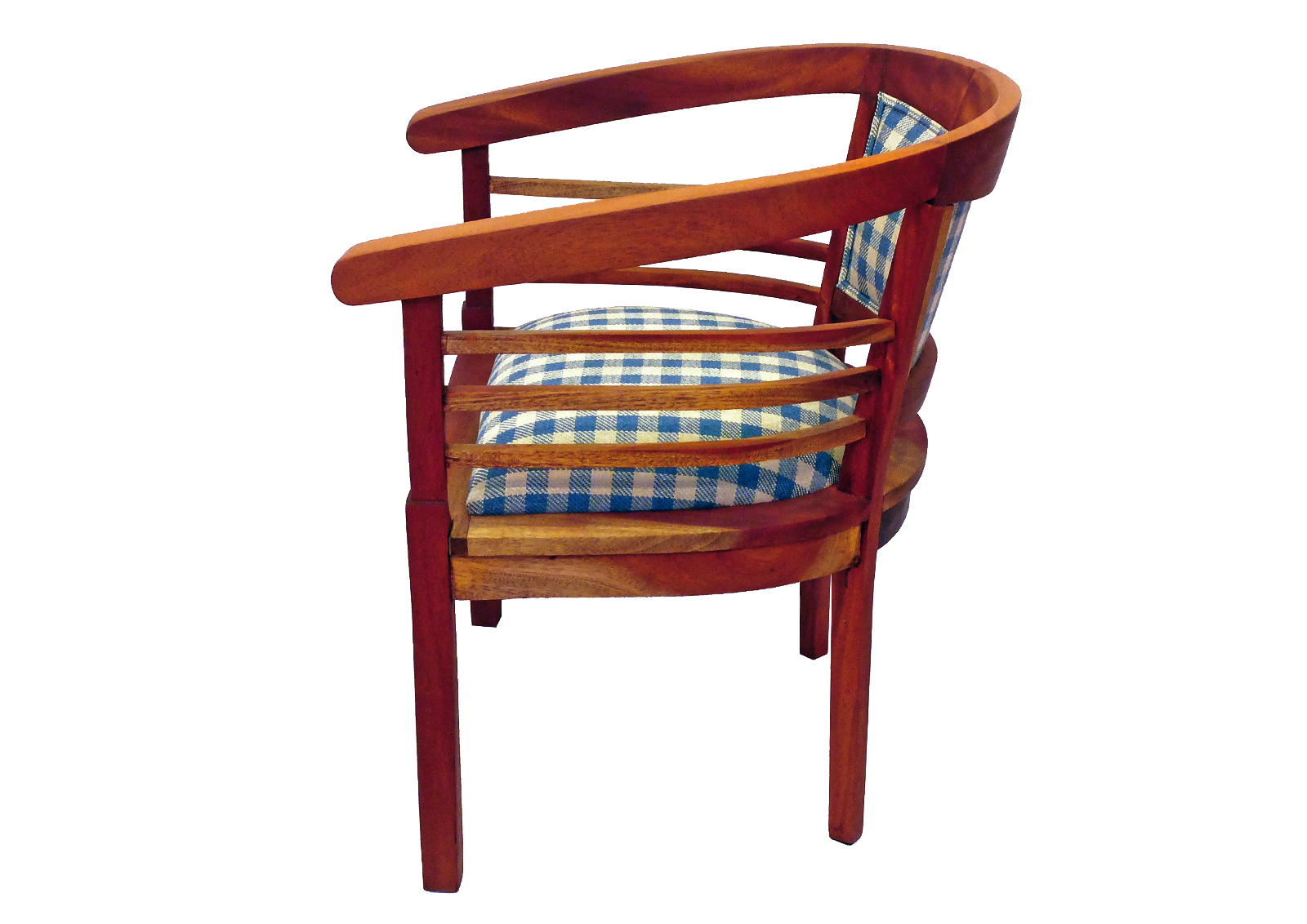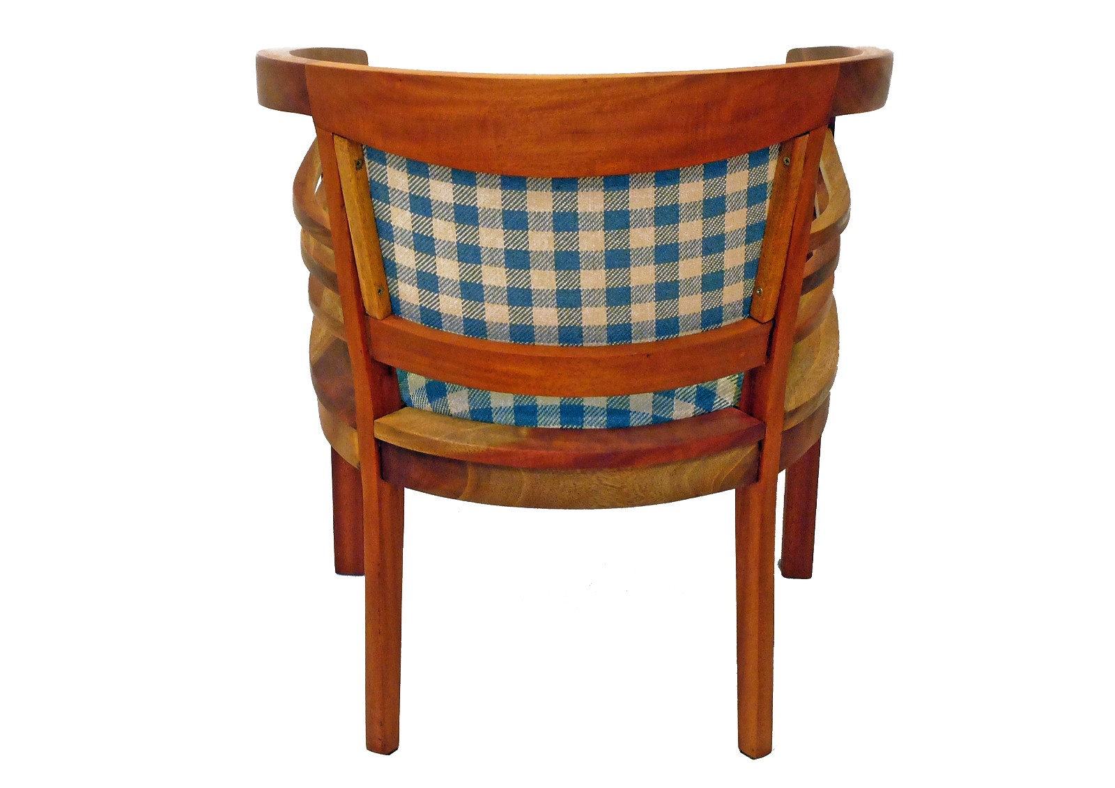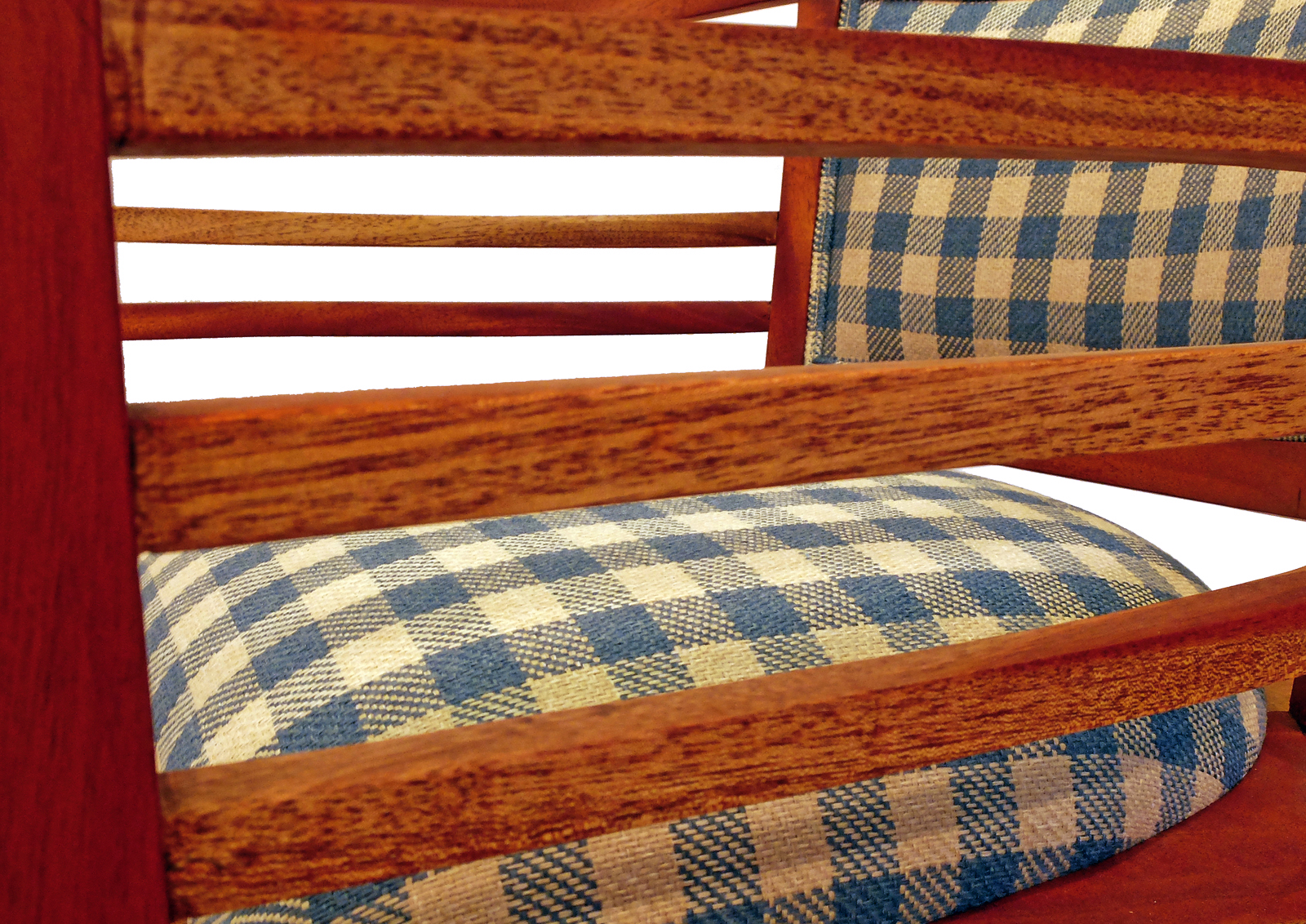 Fotel został całkowicie rozebrany, drewno oczyszczone ze starych powłok lakierniczych, sklejony ponownie, zabezpieczony olejem na bazie naturalnych olei chińskich, przyjaznym dla środowiska. Wykonany z egzotycznego drewna . Nowa tapicerka, wymieniona gąbka, pasy, fizelina. Ręcznie szyty. Bardzo dobrej jakości tkanina, odporność na ścieranie 30 000 suwów. Nowe metalowe śruby. Szkielet wewnątrz oczyszczony dokładnie papierem. Na oparcie które sięga aż do łokci, składa się rząd kilkunastu szczebelków średniej długości. Odpowiednie wyprofilowanie oraz gruba płyta siedzeniowa, zapewniają stabilizację i wygodę użytkowania. Drewno jest bardzo miłe i ciepłe w dotyku. Fizyczne właściwości drewna sprawiają, że fotel jest bardzo praktyczny i do tego wyjątkowo piękny. Klasyczna elegancja to idealny wybór do gabinetu lub salonu.