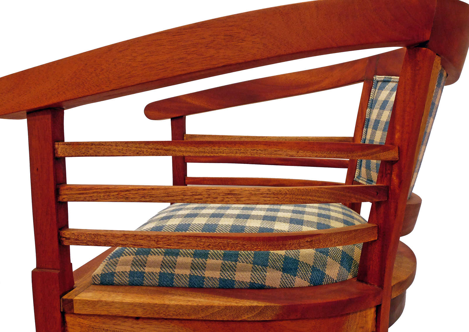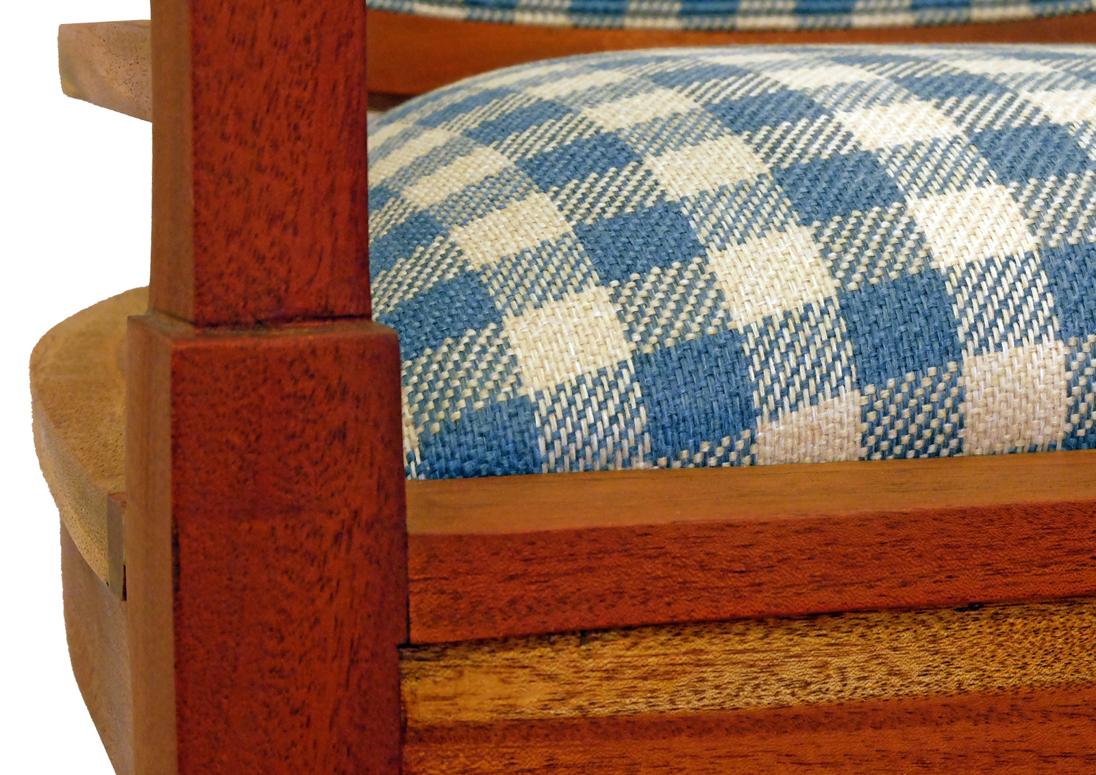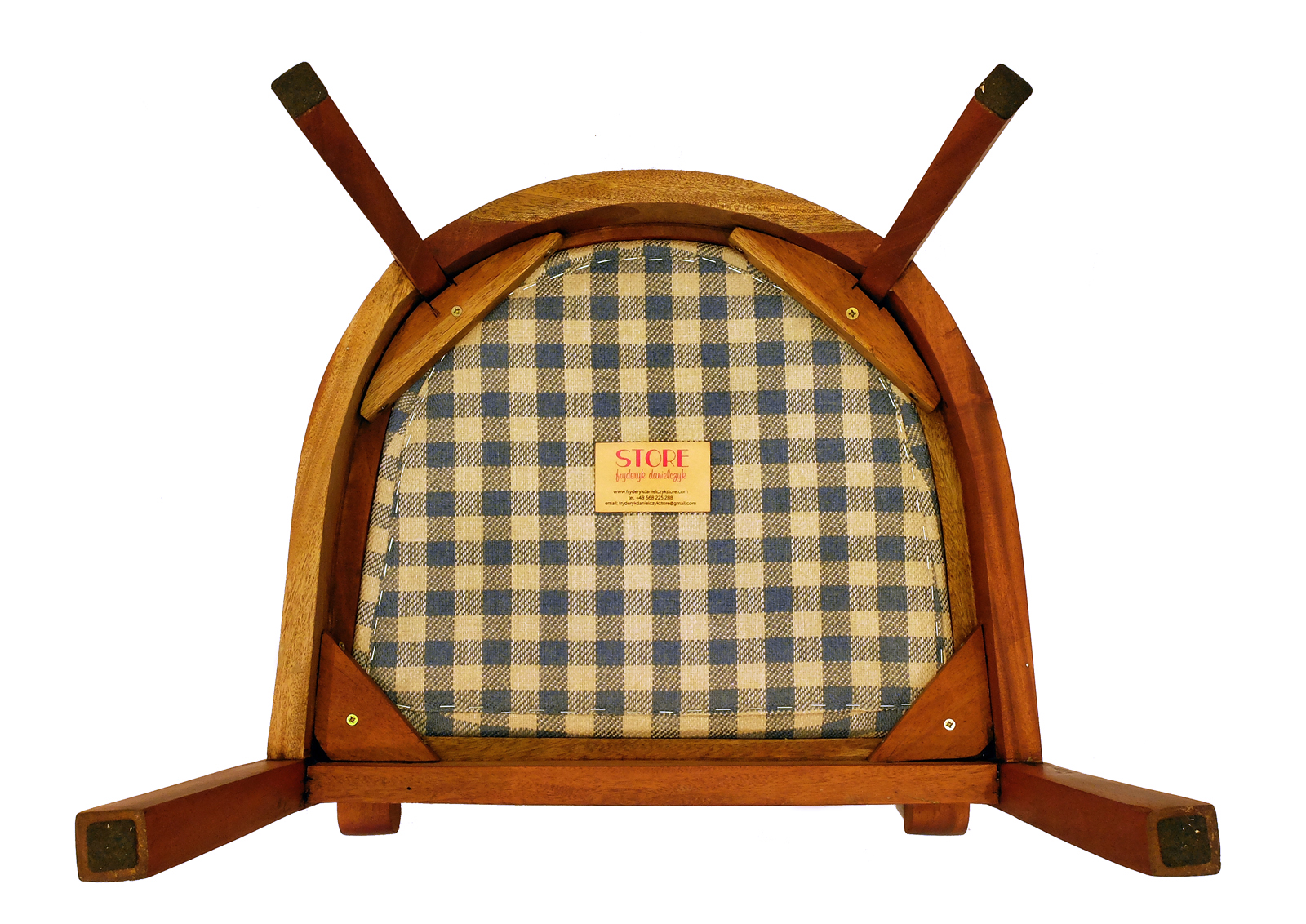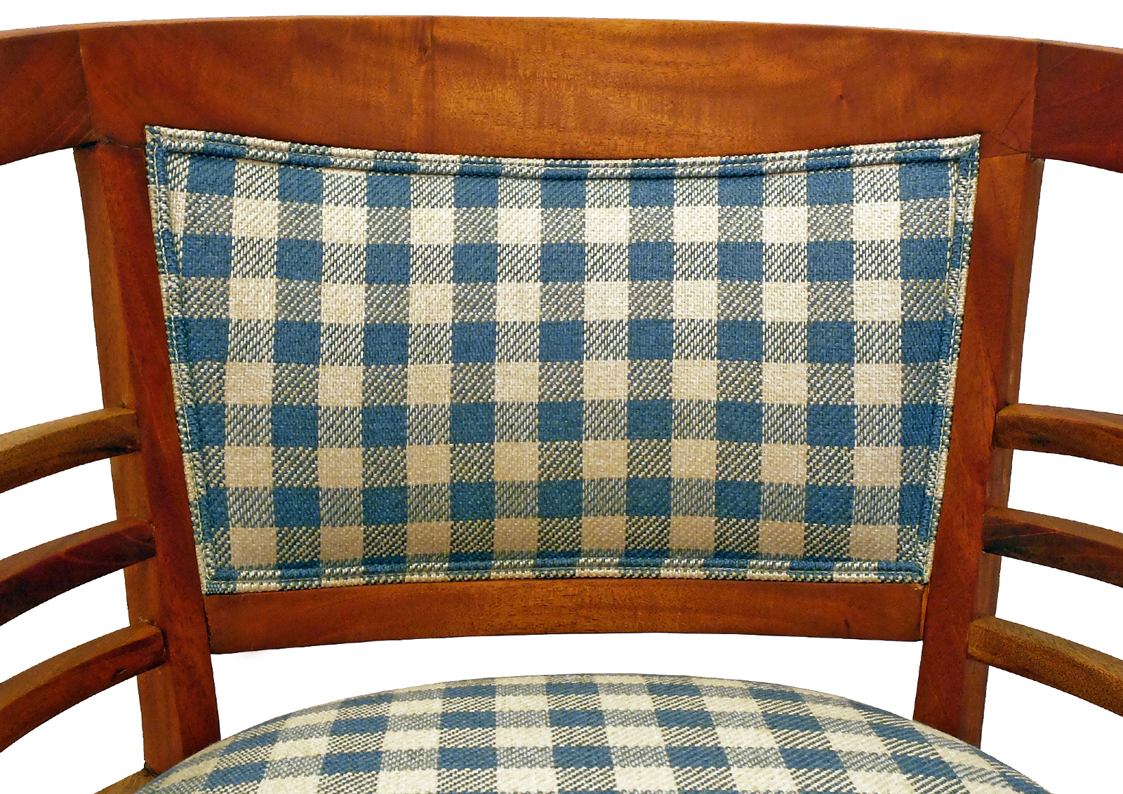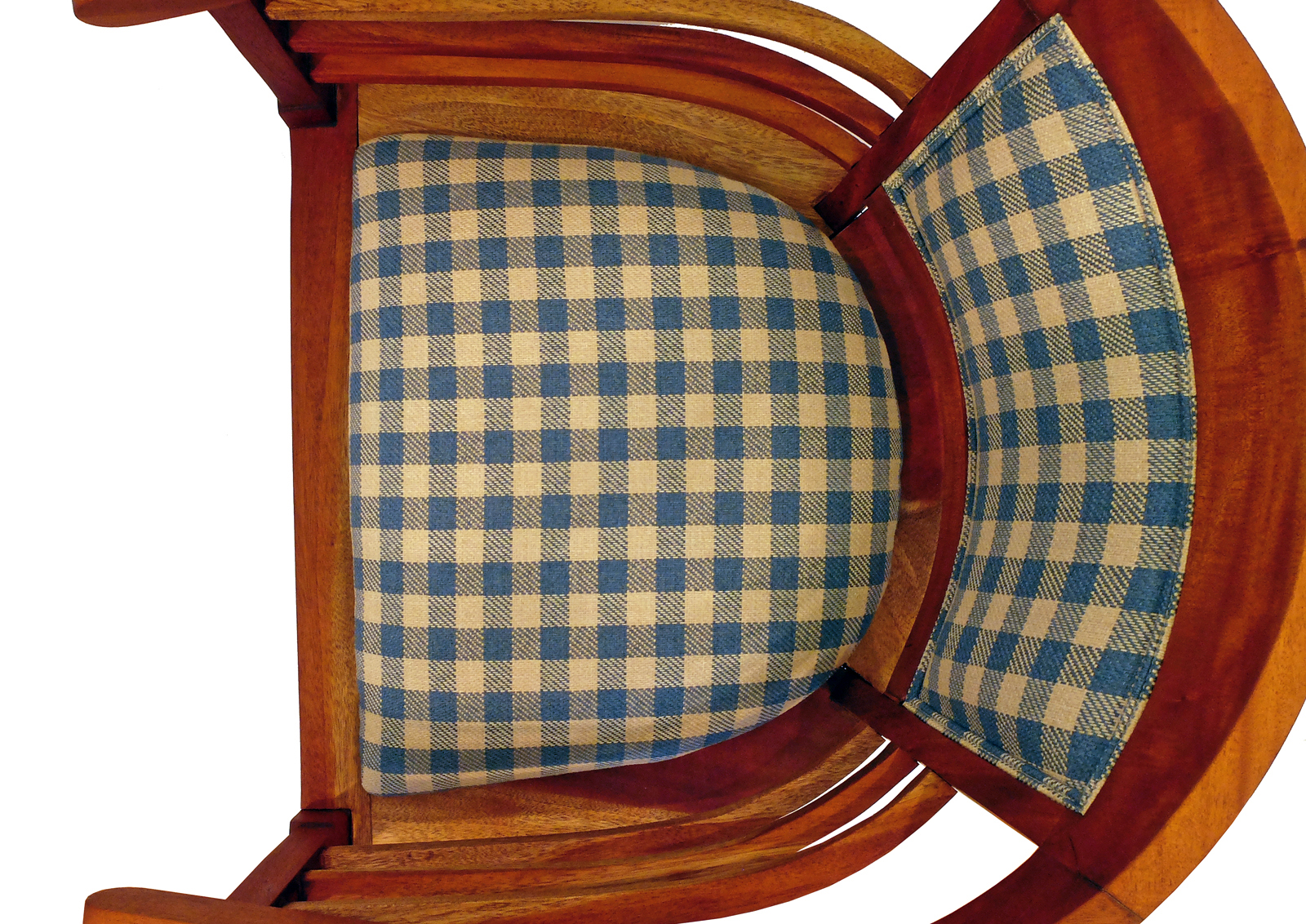 Fotel został całkowicie rozebrany, drewno oczyszczone ze starych powłok lakierniczych, sklejony ponownie, zabezpieczony olejem na bazie naturalnych olei chińskich, przyjaznym dla środowiska. Wykonany z egzotycznego drewna . Nowa tapicerka, wymieniona gąbka, pasy, fizelina. Ręcznie szyty. Bardzo dobrej jakości tkanina, odporność na ścieranie 30 000 suwów. Nowe metalowe śruby. Szkielet wewnątrz oczyszczony dokładnie papierem. Na oparcie które sięga aż do łokci, składa się rząd kilkunastu szczebelków średniej długości. Odpowiednie wyprofilowanie oraz gruba płyta siedzeniowa, zapewniają stabilizację i wygodę użytkowania. Drewno jest bardzo miłe i ciepłe w dotyku. Fizyczne właściwości drewna sprawiają, że fotel jest bardzo praktyczny i do tego wyjątkowo piękny. Klasyczna elegancja to idealny wybór do gabinetu lub salonu.