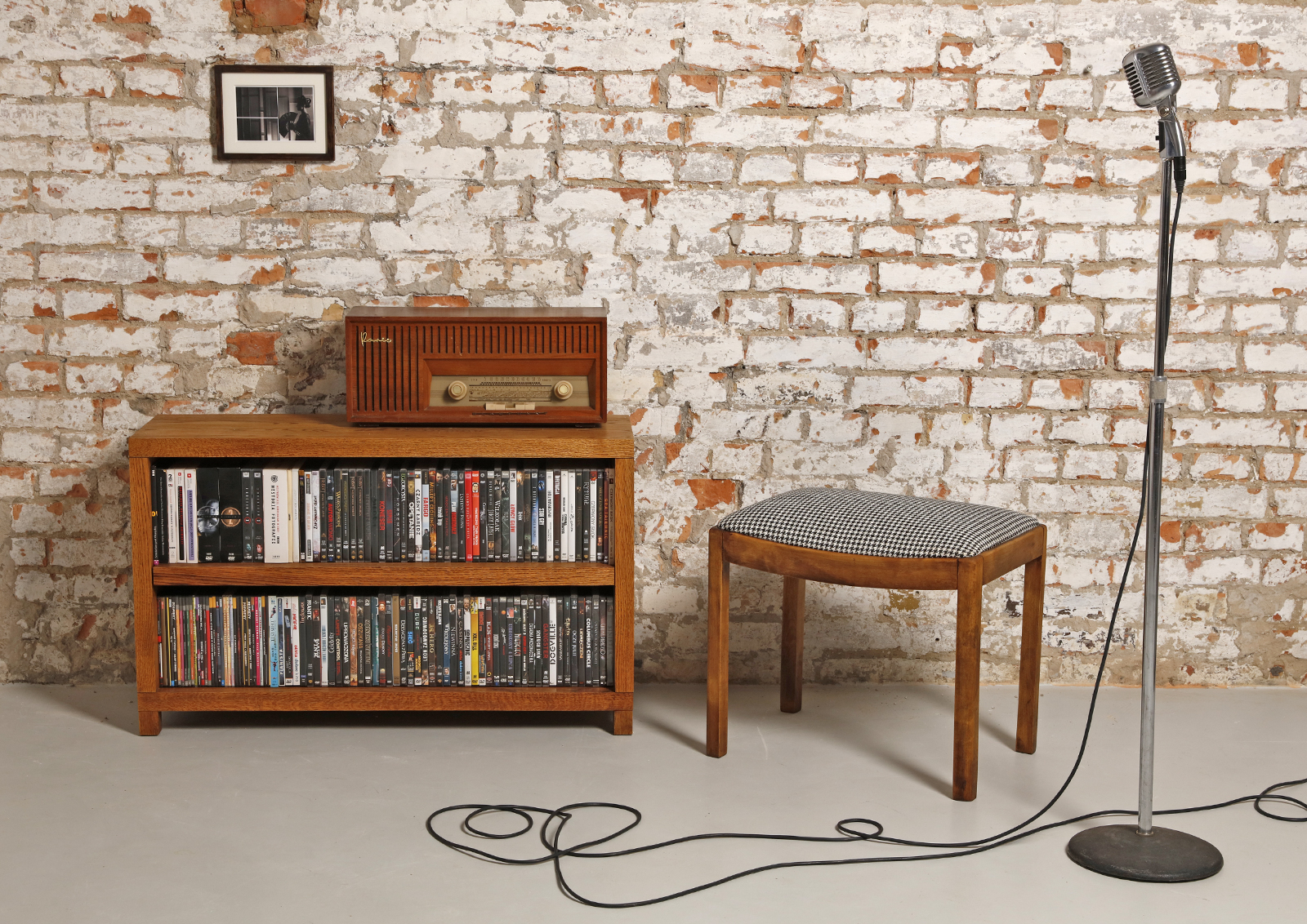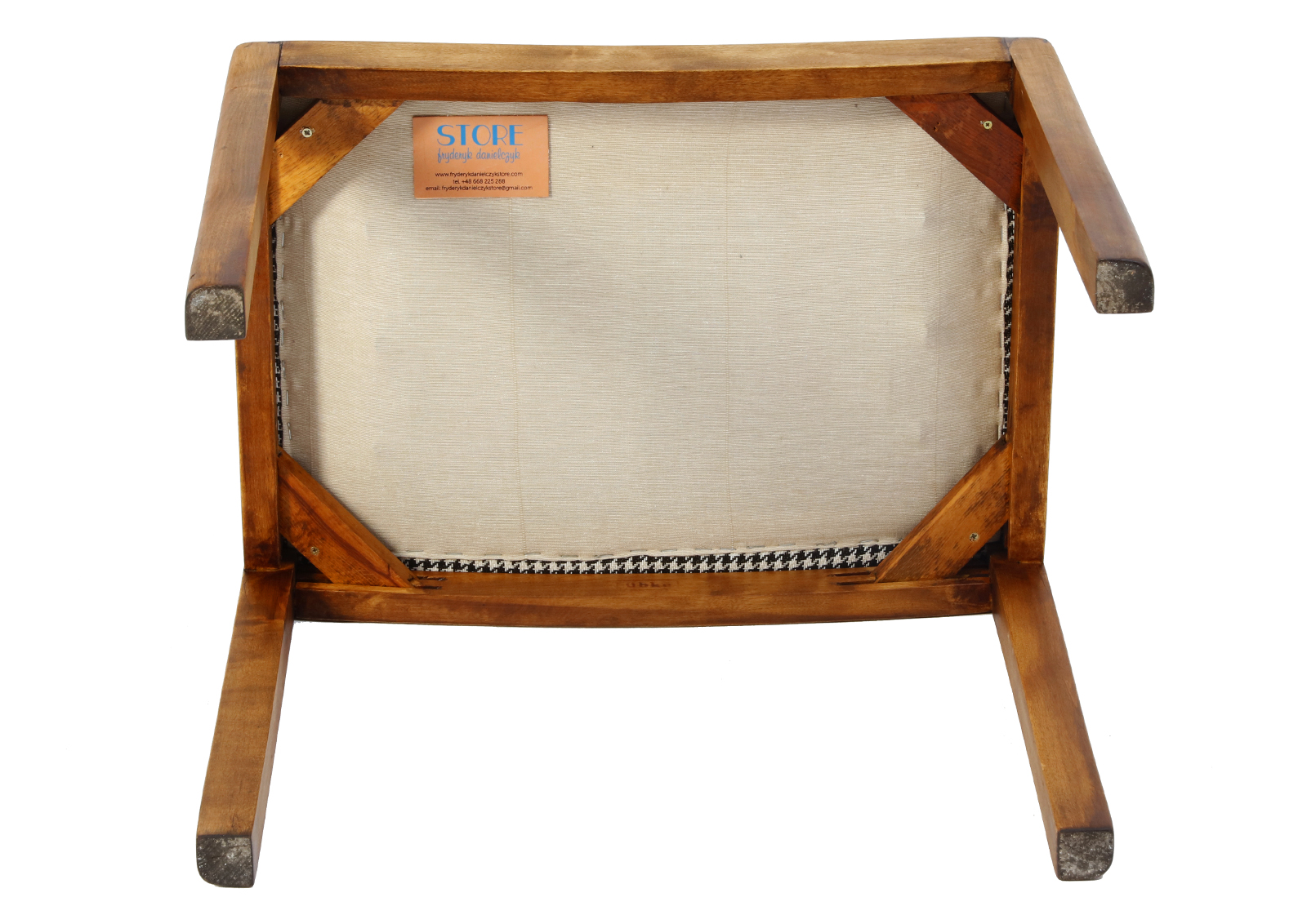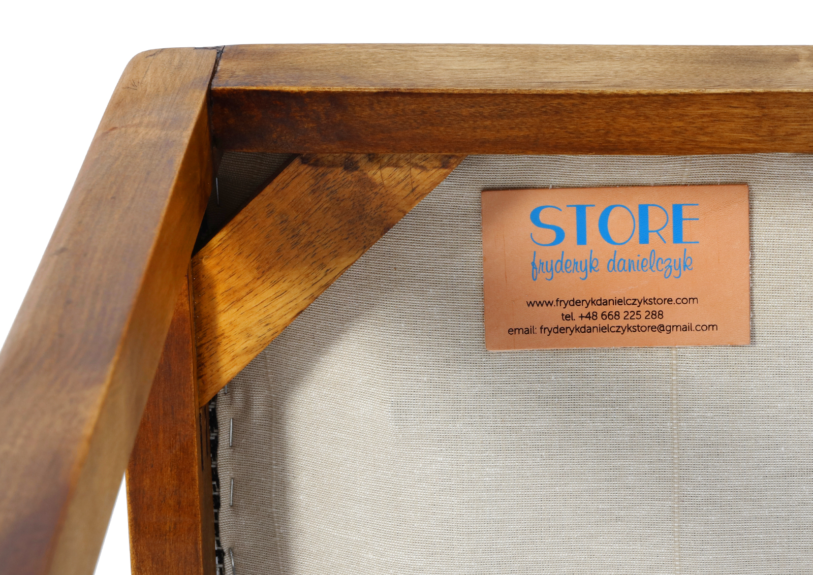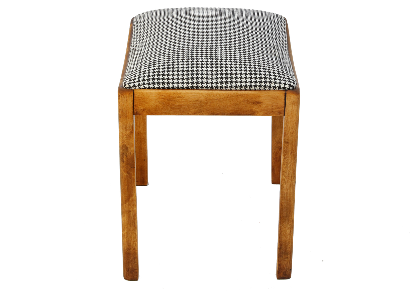 Zrobiony z drewna klonowego. Taboret został całkowicie rozebrany, drewno oczyszczone ze starych powłok, ponownie sklejony, zabezpieczony olejem na bazie naturalnych olei chińskich, przyjaznym dla środowiska. Nowa tapicerka, wymieniona gąbka, pasy, fizelina, ponowne wiązanie sprężyn.  Dobrej jakości tkanina, odporność na ścieranie 20 000 suwów. Bardzo miękki i  wygodny.