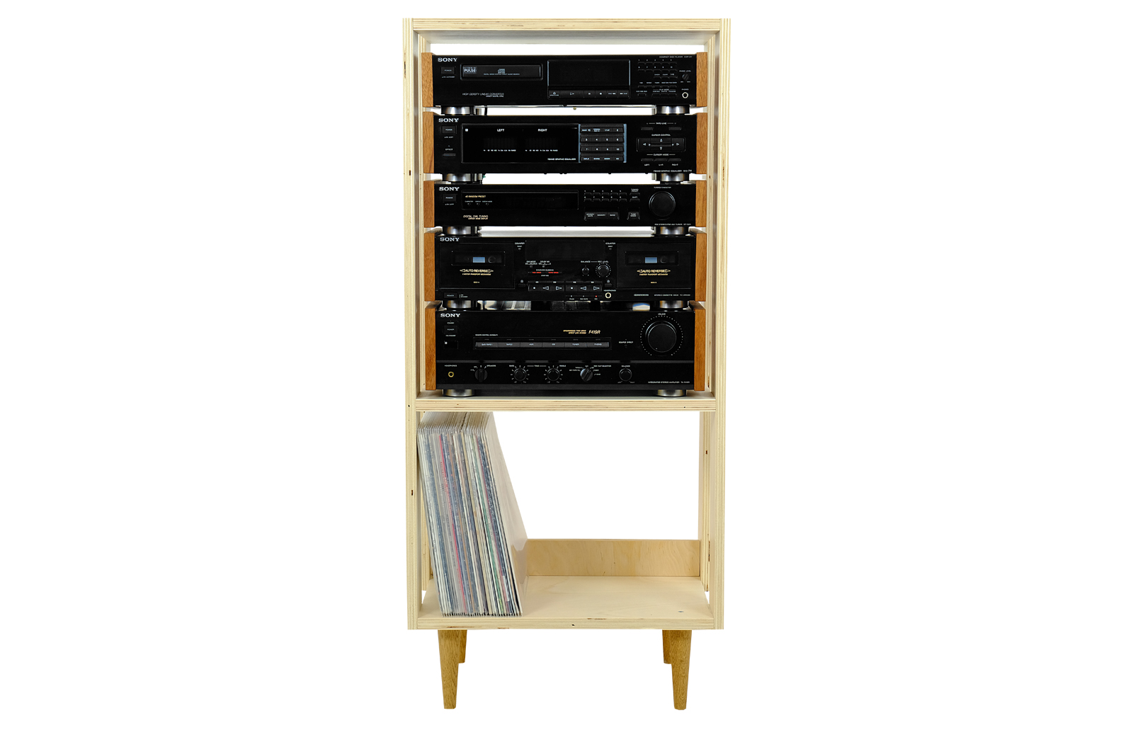 Do prezentowanej wieży została specjalnie zaprojektowana szafka FD Store z wysokiej jakości sklejki wykończonej lakierem satynowym oparta na bukowych nóżkach w stylu vintage. Prosty dizajn szafki podkreśla typowy dla lat 90tych charakter wieży i będzie świetnie prezentować się zarówno w industrialnym lofcie, jak i stylowych skandynawskich wnętrzach.